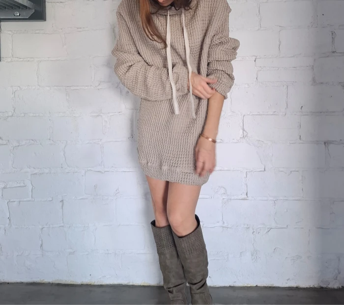 Szukasz wygody i naturalnych materiałów? Ta bluza z kapturem to idealny wybór na co dzień i na weekend. Uszyta z wysokiej jakości tkaniny typu wafel (48% len, 52% bawełna), zachwyca swoją strukturą i lekkością. Wzbogacona o kolorowe, lniane dodatki – takie jak troczki i wykończenie wewnątrz kaptura – nadaje jej unikalny charakter. Model o luźnym, oversize’owym kroju jest niezwykle komfortowy i uniwersalny – świetnie sprawdzi się zarówno dla kobiet, jak i mężczyzn. Dół bluzy oraz rękawy wykończone są ściągaczem z tej samej tkaniny, a dodatkowa gumka w mankietach zapewnia lepsze dopasowanie. To doskonały wybór na luźne dni – zestaw ją z legginsami, jeansami lub kolarkami i ciesz się swobodą w stylu slow fashion.