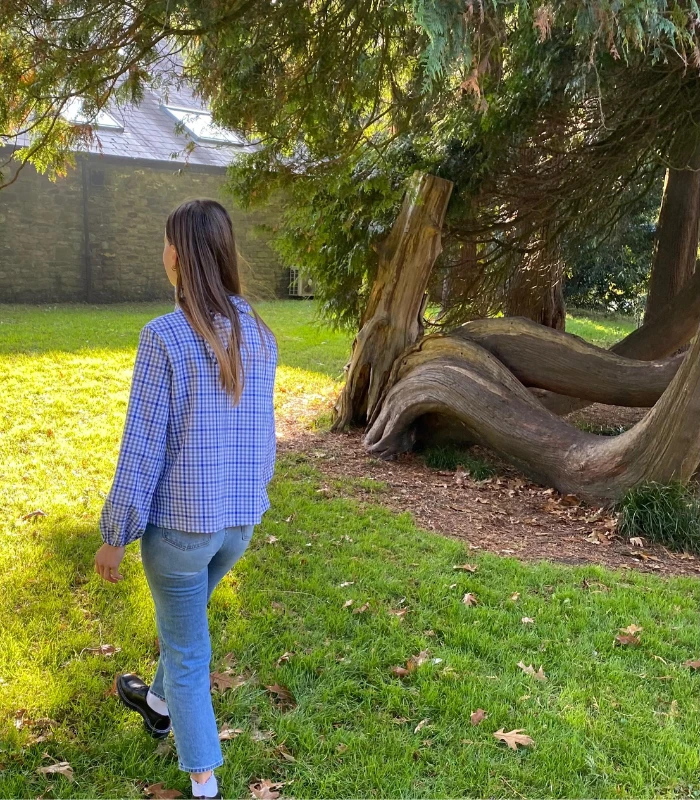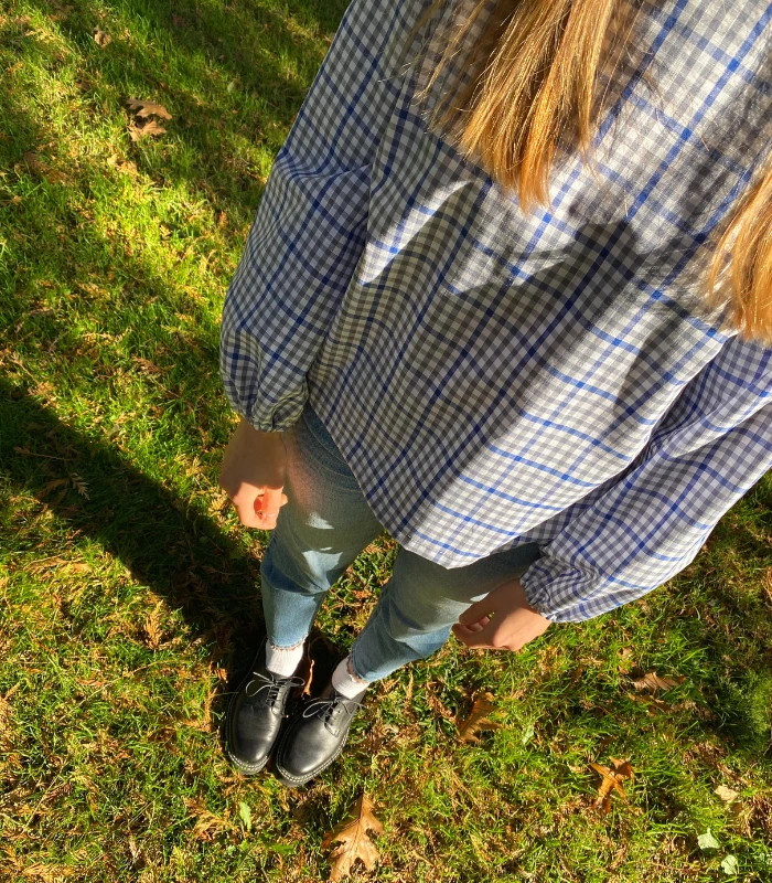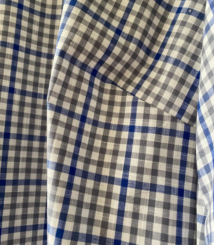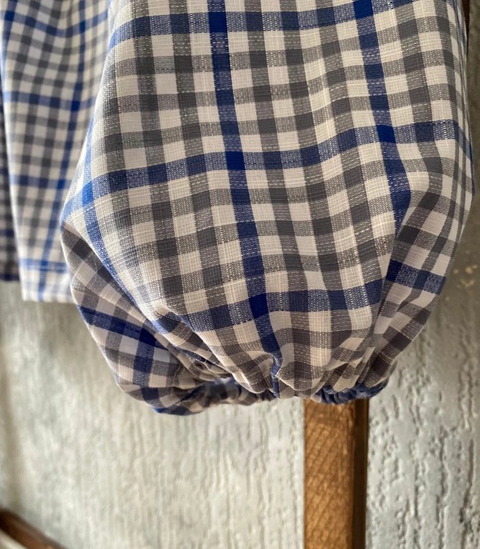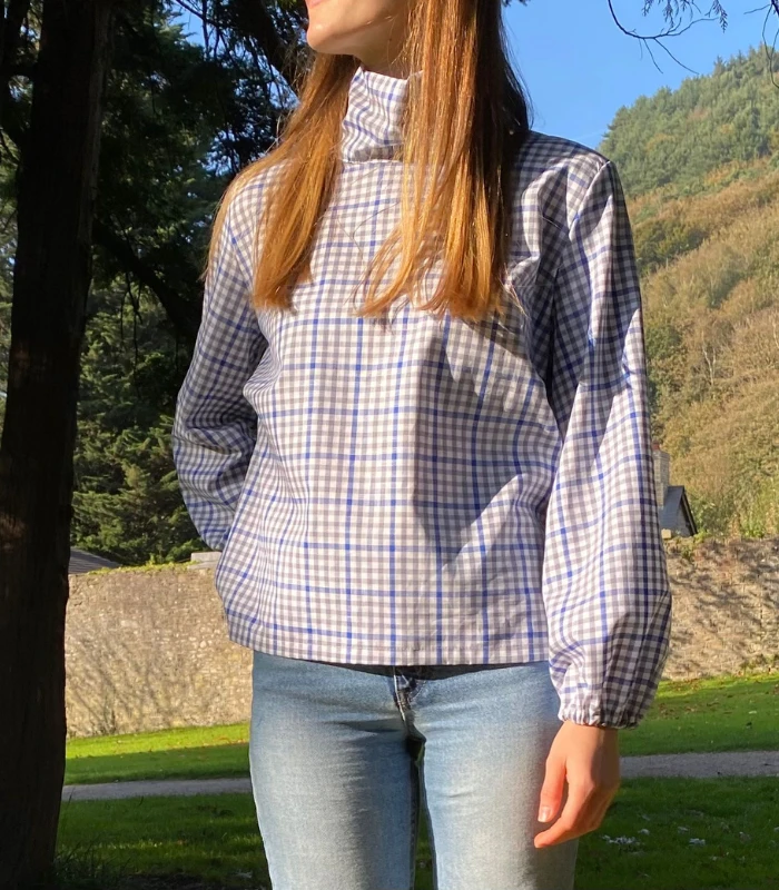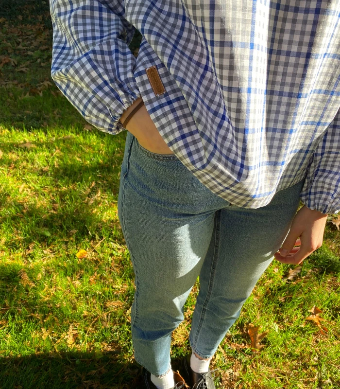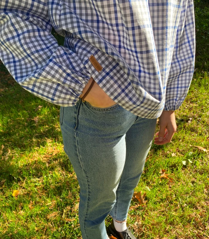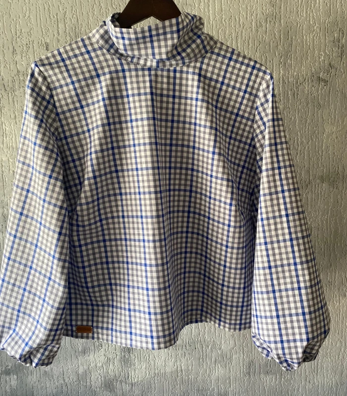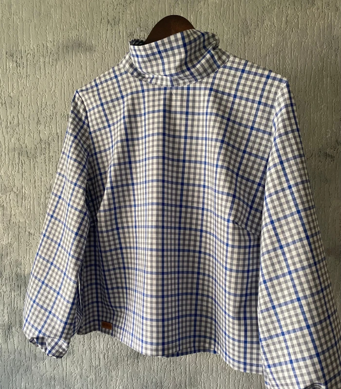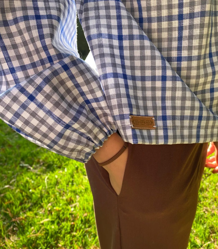 Lniano-bawełniana bluzka z półgolfem i wiązaniem - wygoda w stylowej odsłonie. Stylowa i wygodna - ta bluzka uszyta z naturalnej mieszanki lnu i bawełny - 52% bawełny, 48% lnu (gramatura 190g) to idealna propozycja na co dzień i do pracy. Delikatna w dotyku, ale z charakterem - wyróżnia się klasycznym wzorem w kratę oraz oryginalnym półgolfem z efektownym wiązaniem z tyłu. Zaszewki na biuście zapewniają lepsze dopasowanie i komfort noszenia, a szerokie rękawy wykończone gumką nadają lekkości oraz subtelnego luzu. Prosty, ale niebanalny krój sprawia, że bluzka świetnie komponuje się zarówno z dżinsami, jak i z eleganckimi spodniami czy spódnicą. To ponadczasowy element garderoby, który łączy naturalne materiały z ciekawym designem - idealny wybór na każdą porę. roku.
