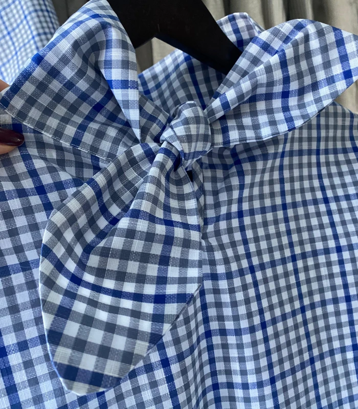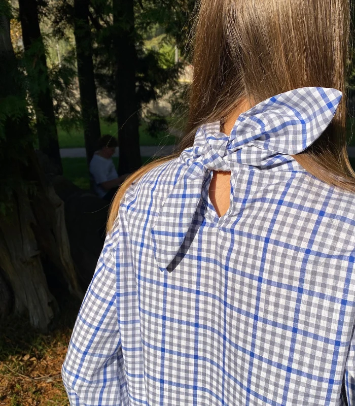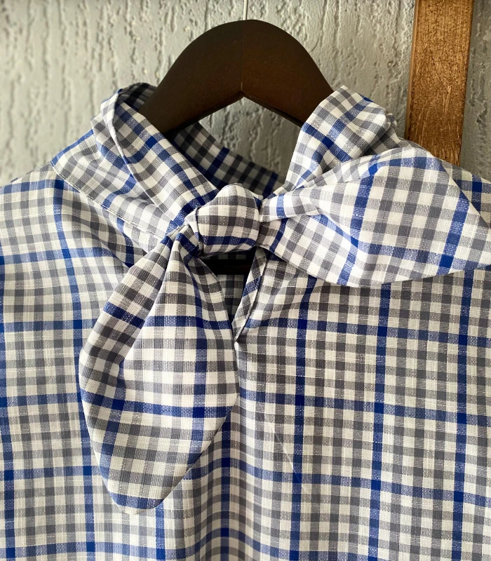 BLUZKA w kratkę WIĄZANA, lniano-bawełniana