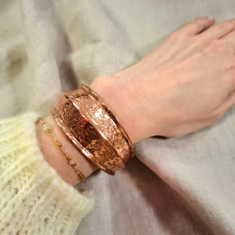 Bransoletka jest wykonana z jednego kawałka miedzi. Jest to rękodzieło i może posiadać niedoskonałości jak drobne rysy czy przebarwienia na wewnętrznej stronie. Biżuteria miedziana już tak ma.