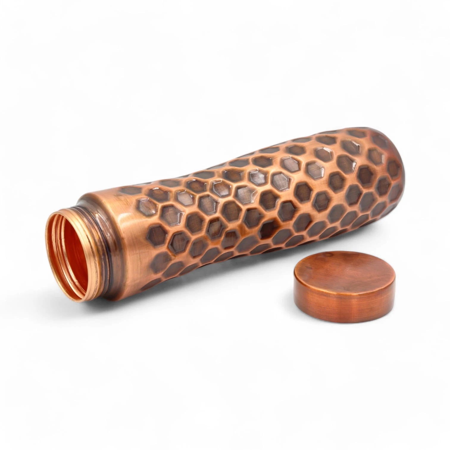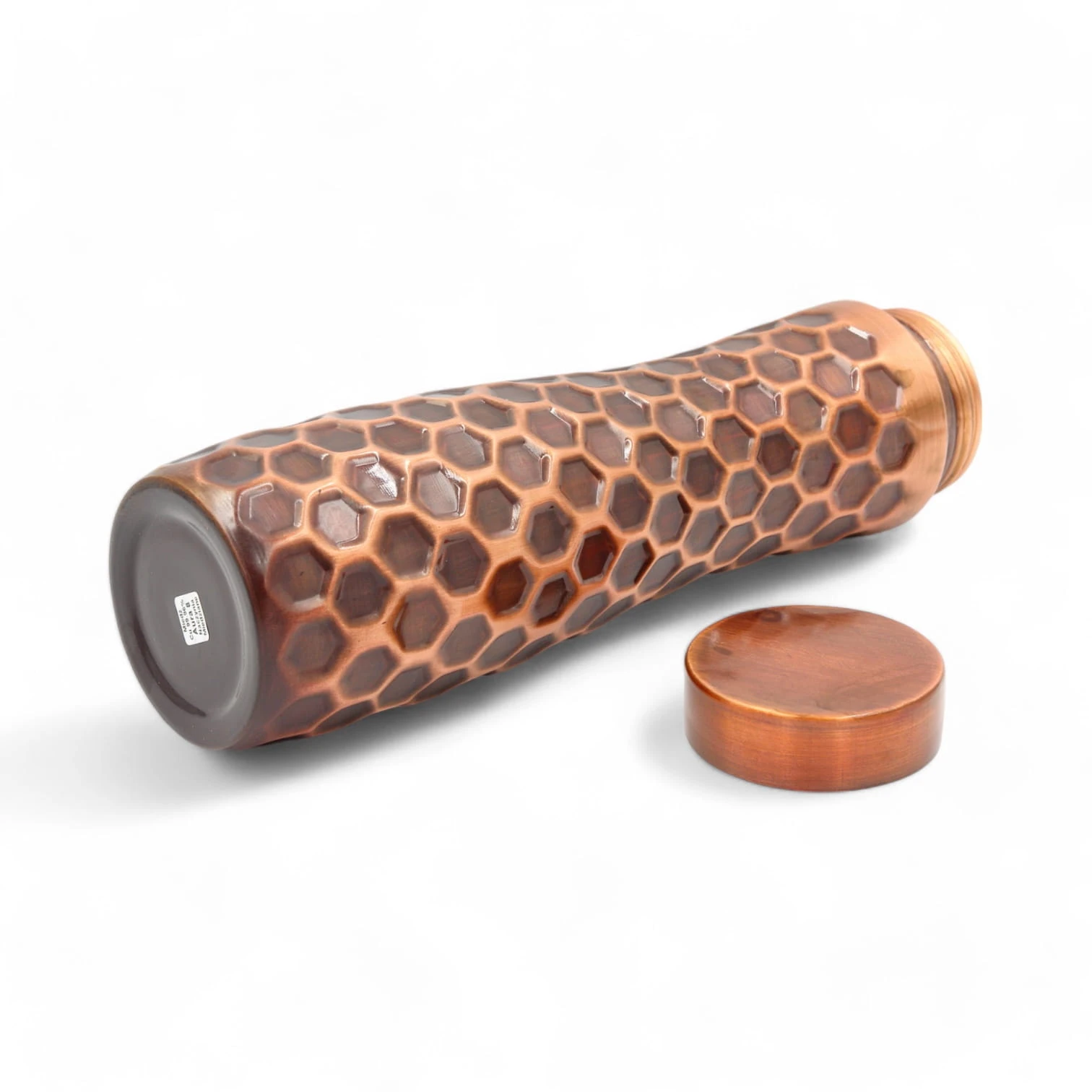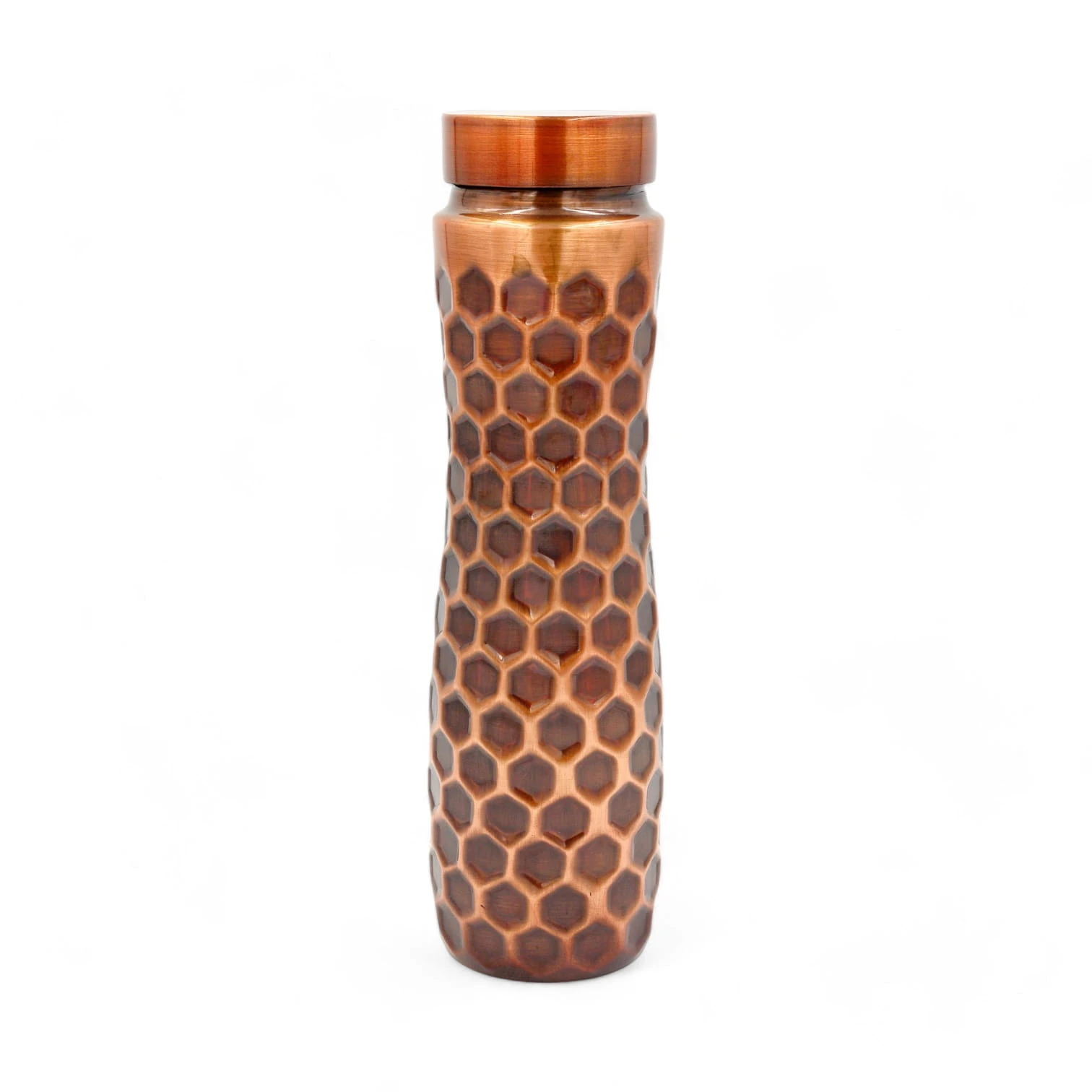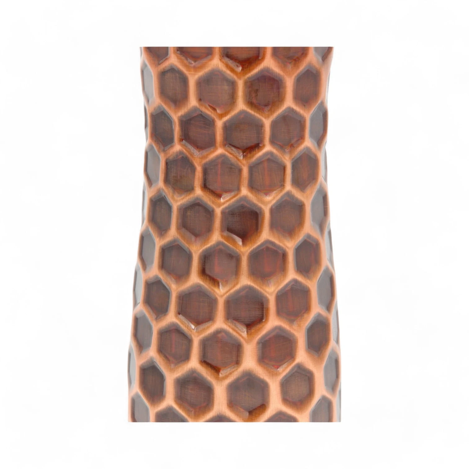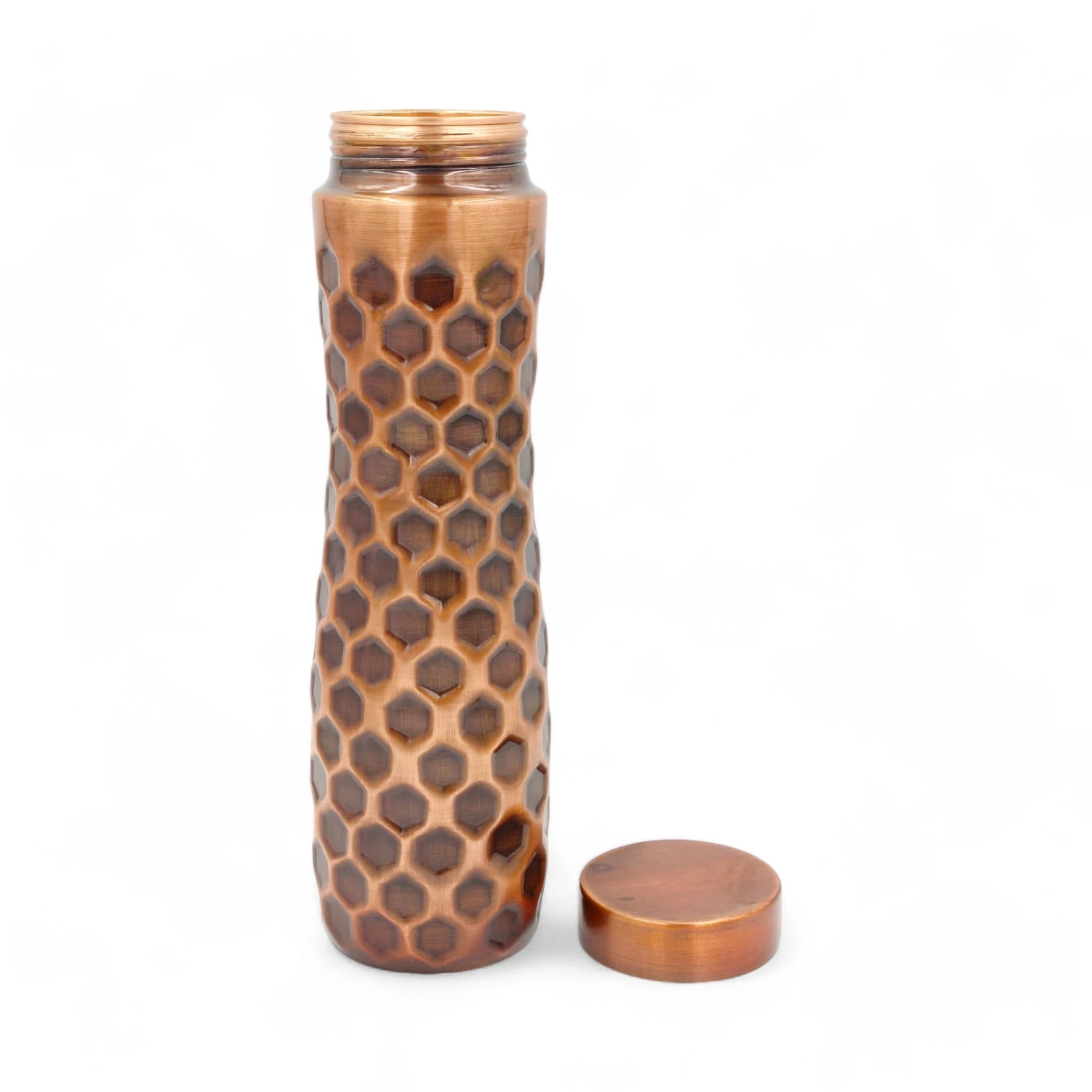 Solidna i elegancka sportowa miedziana butelka z motywem plastra miodu i z dodatkowym zabezpieczeniem powłoki zewnętrznej przed utlenianiem i zmianami koloru.
