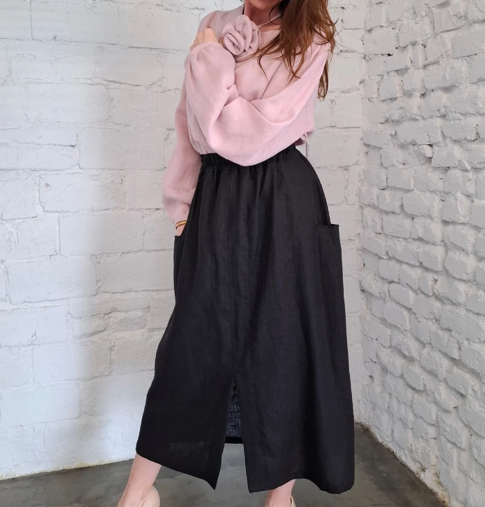 Każdy element tej kolekcji lnianej uszyty jest w ilości ograniczonej, tj. 1-2 szt. Zatem jest to produkt unikatowy, stworzony dzięki kreatywności naszej projektantki. Nie znajdziesz go w masowej produkcji, co jest gwarancją oryginalności i niepowtarzalnego stylu.