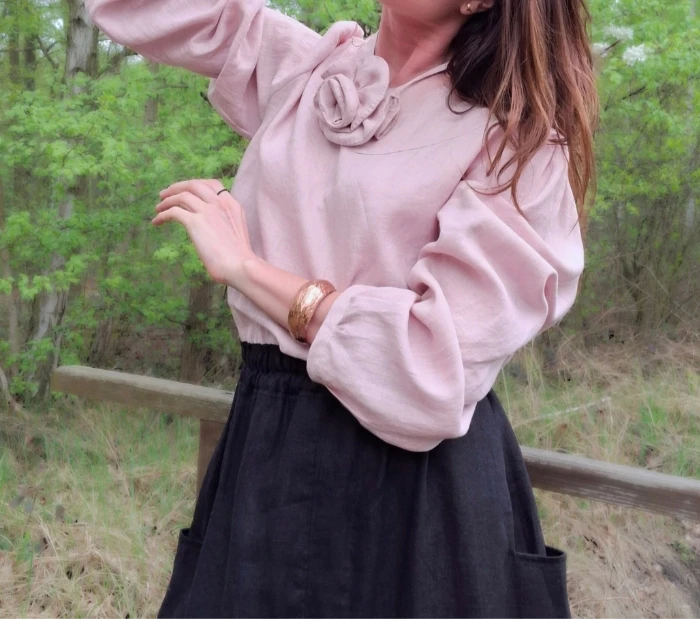 Bluzka damska wykonana z tkaniny lnianej 100% , o gramaturze 130g/m2. To wyjątkowa propozycja bluzki, która podkreśla szlachetność lnu. Subtelna, delikatna i kobieca. Z fantazyjnie wykończonymi lamówką rękawami, nieco bufiastymi by nadać jeszcze więcej lekkości i zwiewności. Dodatek zawiązywanego chokera w kształcie róży pozwala na dowolne wykorzystanie. Zawiązać go można tradycyjnie wokół szyi nadając elegancji, ale też wpleść we włosy czy zawiązać na pasie czy ręce.
