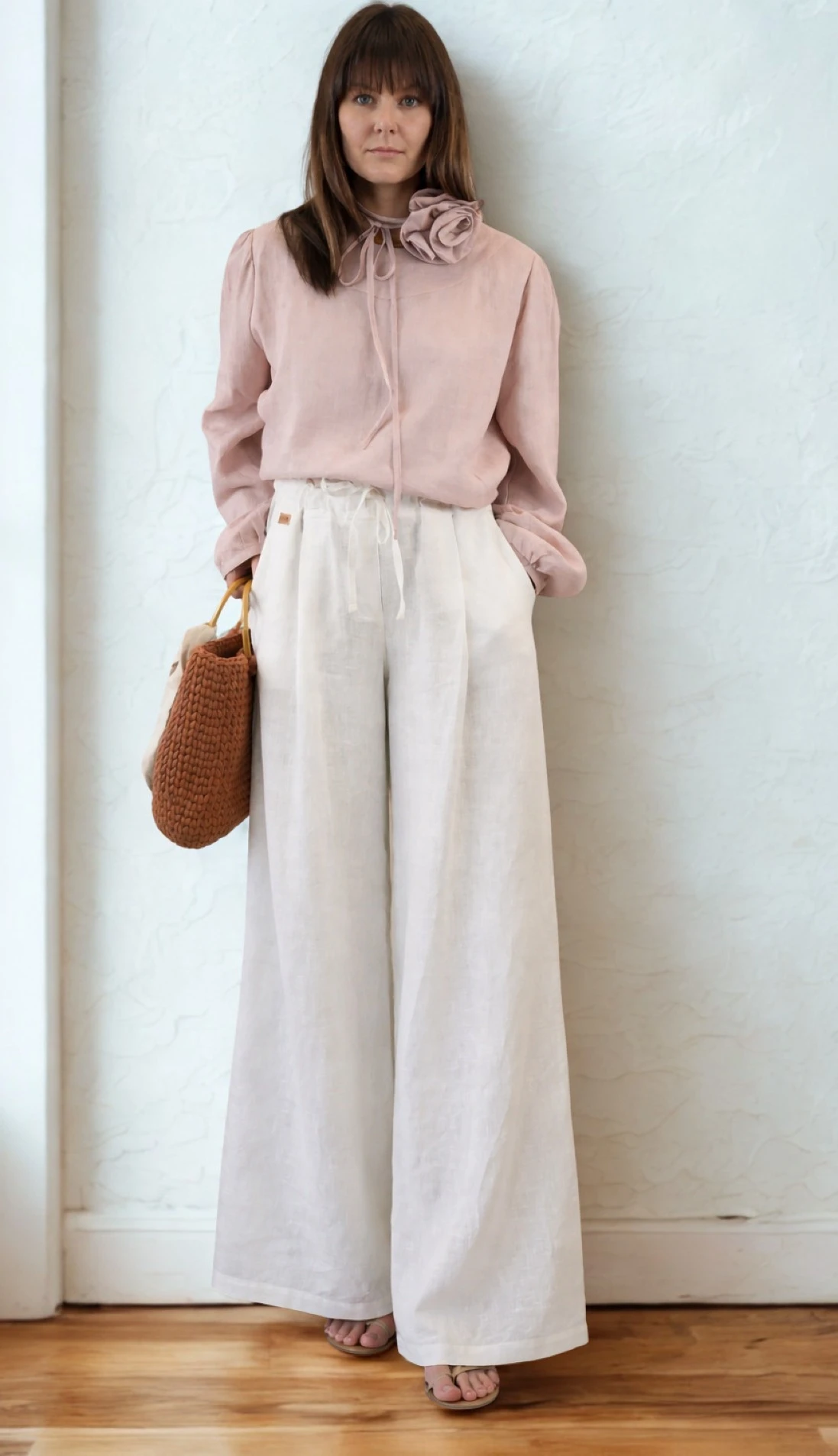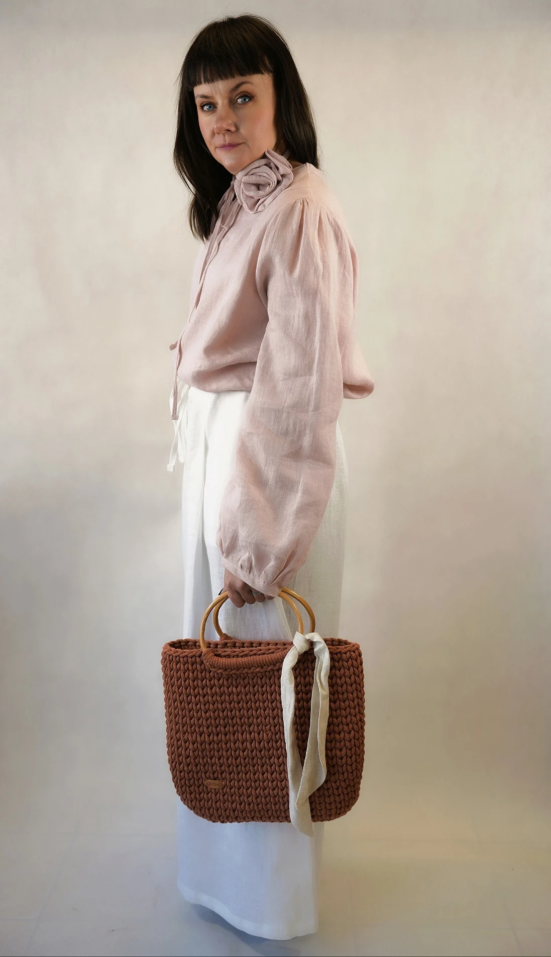 Bluzka koszulowa damska, mglisty róż LEN 100% - z chokerem w kształcie RÓŻY