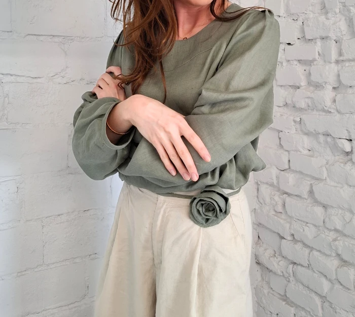 Bluzka damska wykonana z tkaniny lnianej 100% , o gramaturze 130g/m2. To wyjątkowa propozycja bluzki, która podkreśla szlachetność lnu. Subtelna, delikatna i kobieca. Z fantazyjnie wykończonymi lamówką rękawami, nieco bufiastymi by nadać jeszcze więcej lekkości i zwiewności. Dodatek zawiązywanego chokera w kształcie róży pozwala na dowolne wykorzystanie. Zawiązać go można tradycyjnie wokół szyi nadając elegancji, ale też wpleść we włosy czy zawiązać na pasie czy ręce.