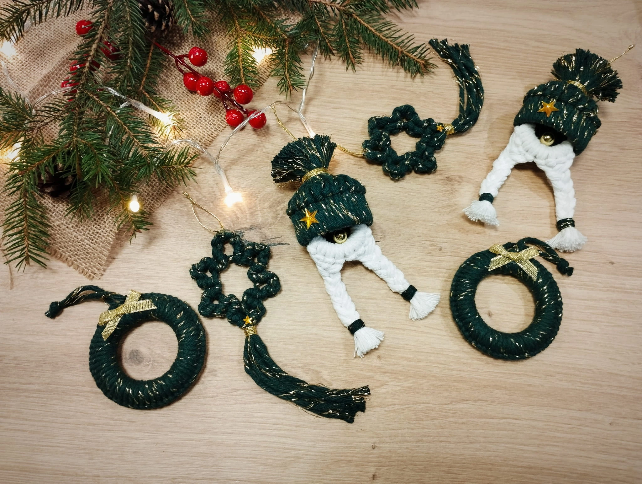 Box świąteczny z ozdobami ze sznurka - Boże Narodzenie - 6 elementów, ciemnozielony ze złotą nitką