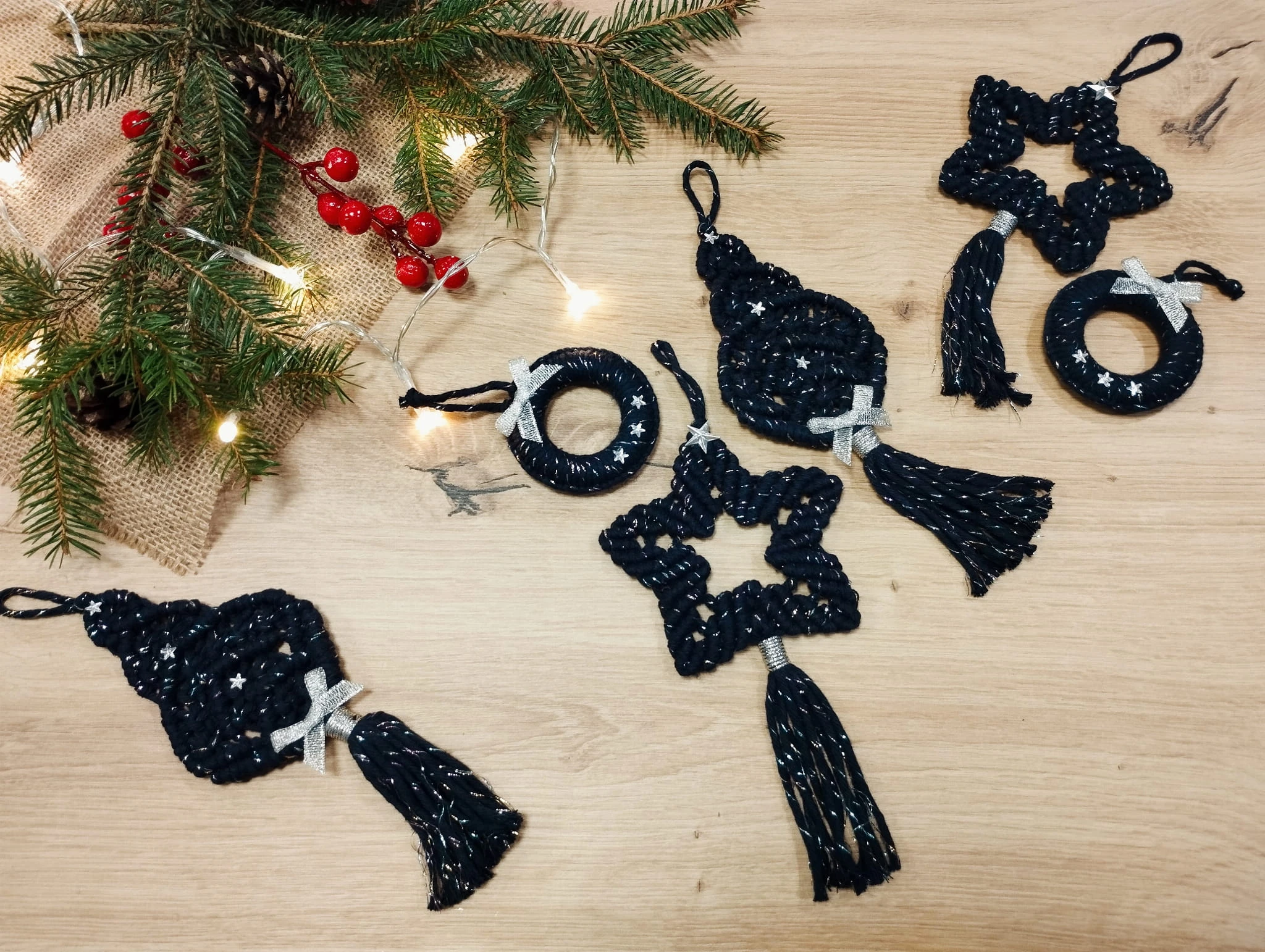 Box świąteczny z ozdobami ze sznurka - Boże Narodzenie - 6 elementów, granatowy z błyszczącą nitką