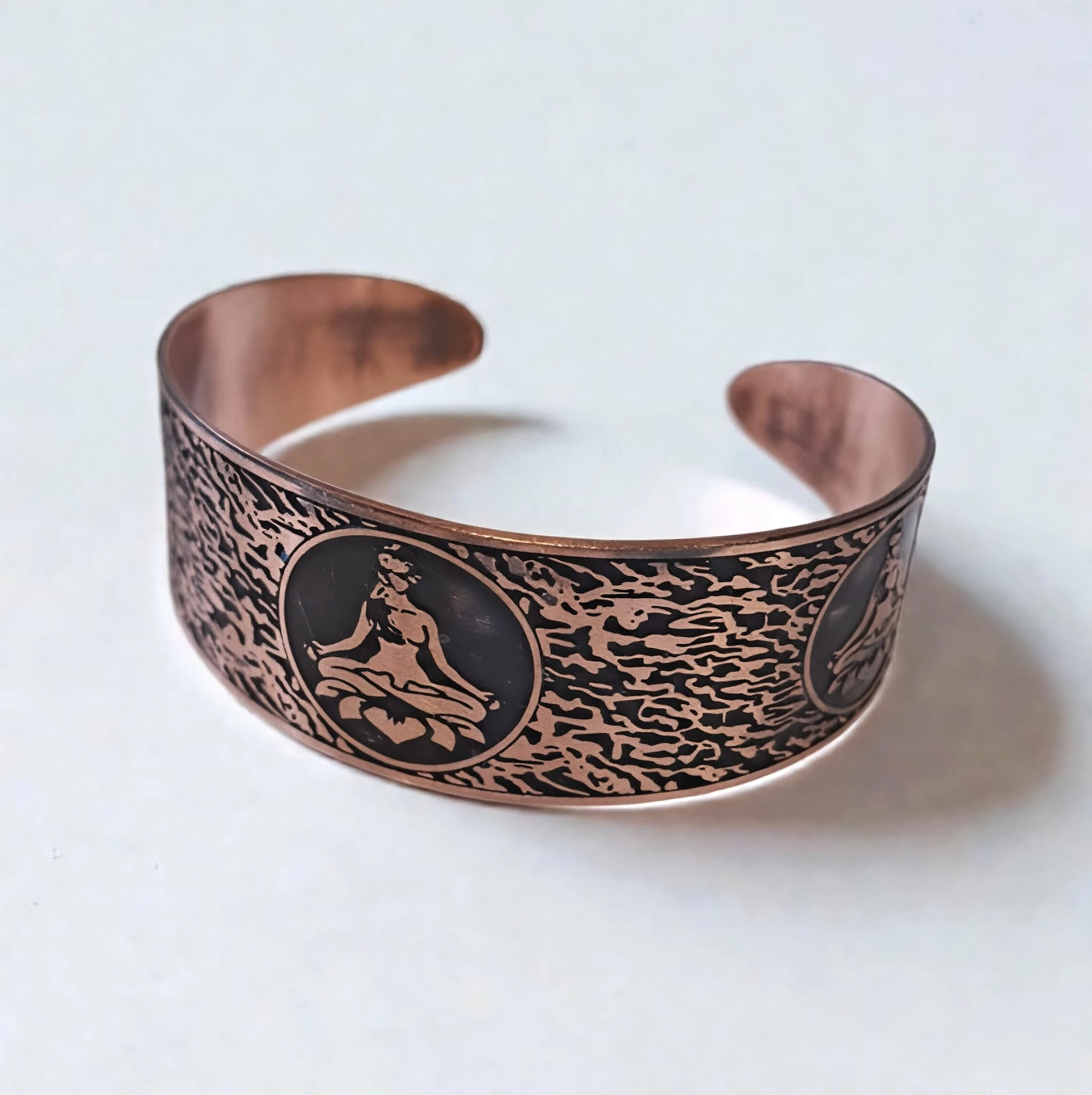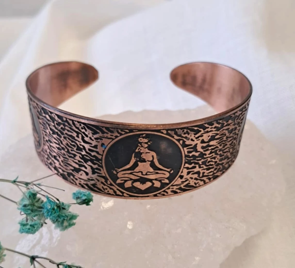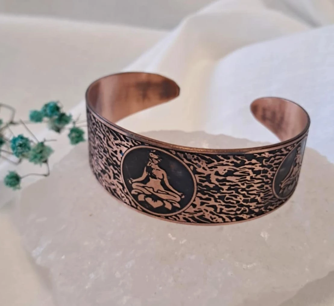 Damska bransoletka miedziana" Kwiat Lotosu" to stylowy i unikatowy dodatek, który łączy w sobie naturalne piękno miedzi z artystycznym wzorem. Na powierzchni biżuterii widnieje wyrazisty motyw kwiata Lotosu na czarnym tle , tworzący efektowny kontrast i podkreślający głębie detali.