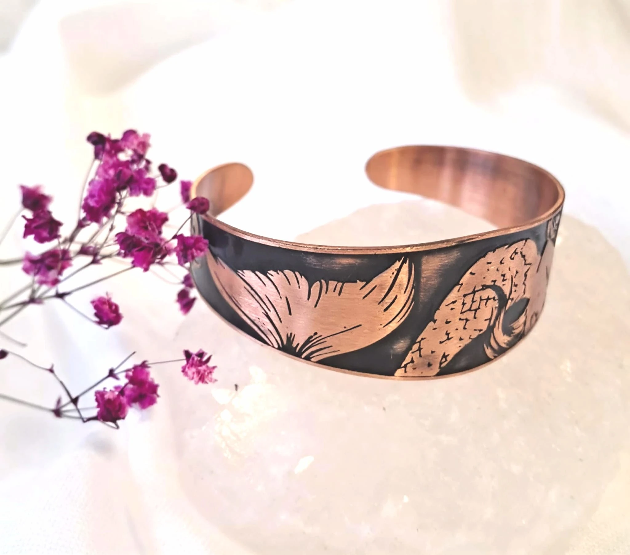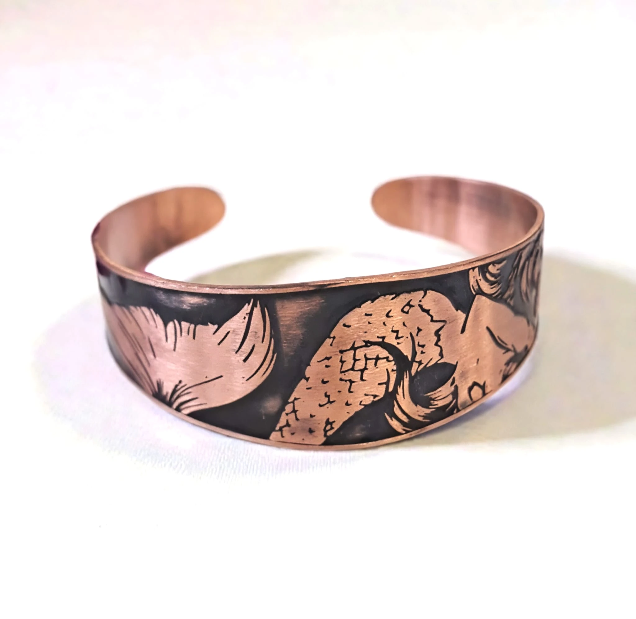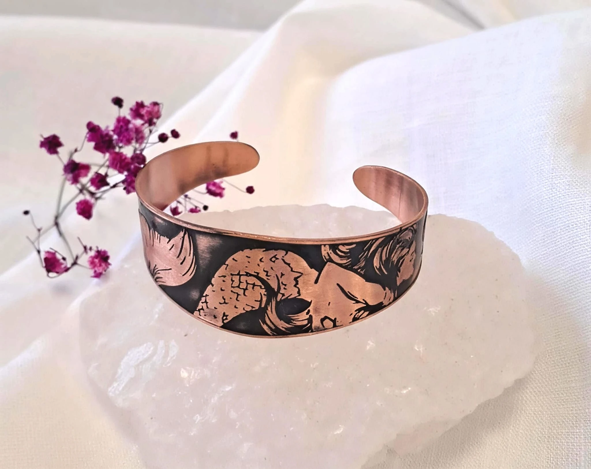 Damska bransoletka miedziana" Syrena" to stylowy i unikatowy dodatek, który łączy w sobie naturalne piękno miedzi z artystycznym wzorem. Na powierzchni biżuterii widnieje wyrazisty motyw syreny na czarnym tle, tworzący efektowny kontrast i podkreślający głębie detali.