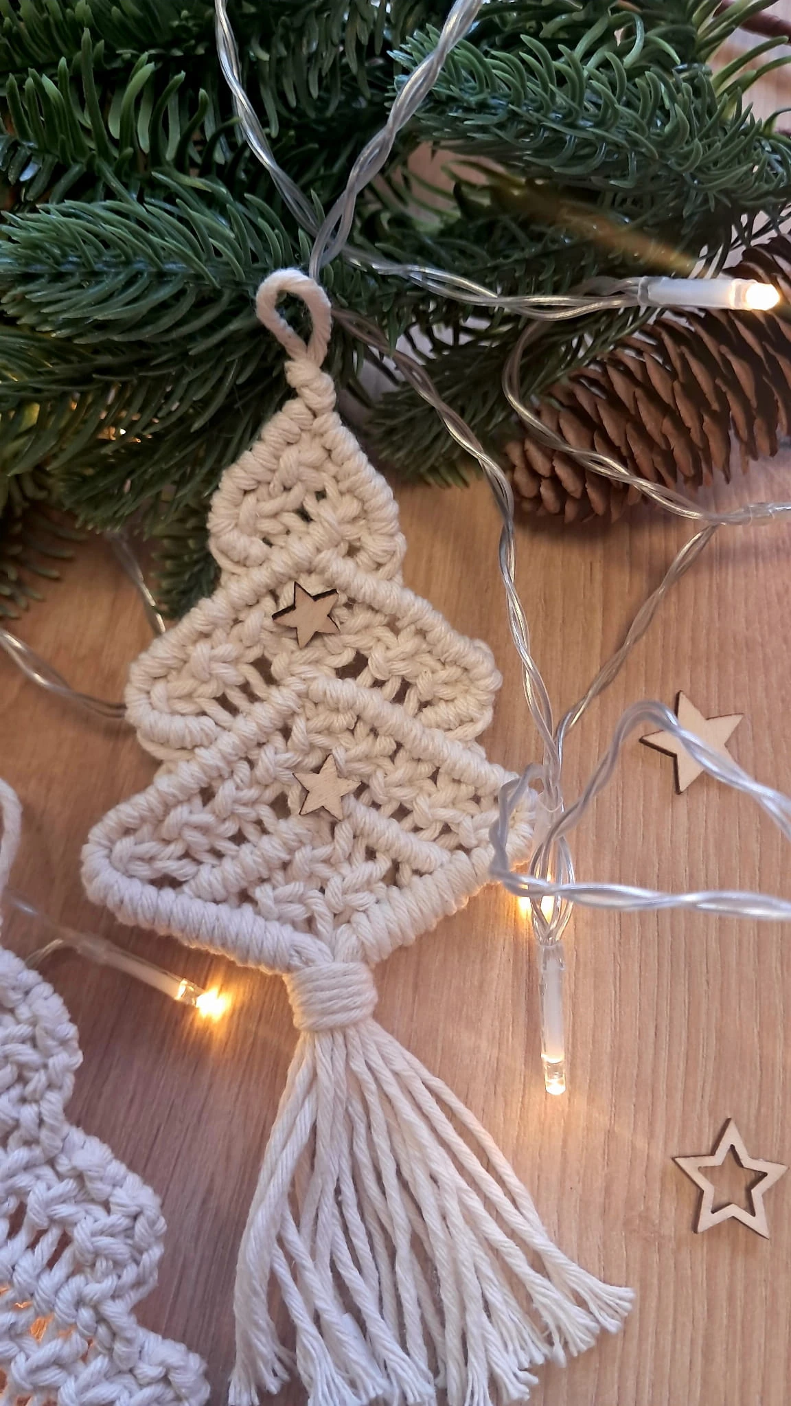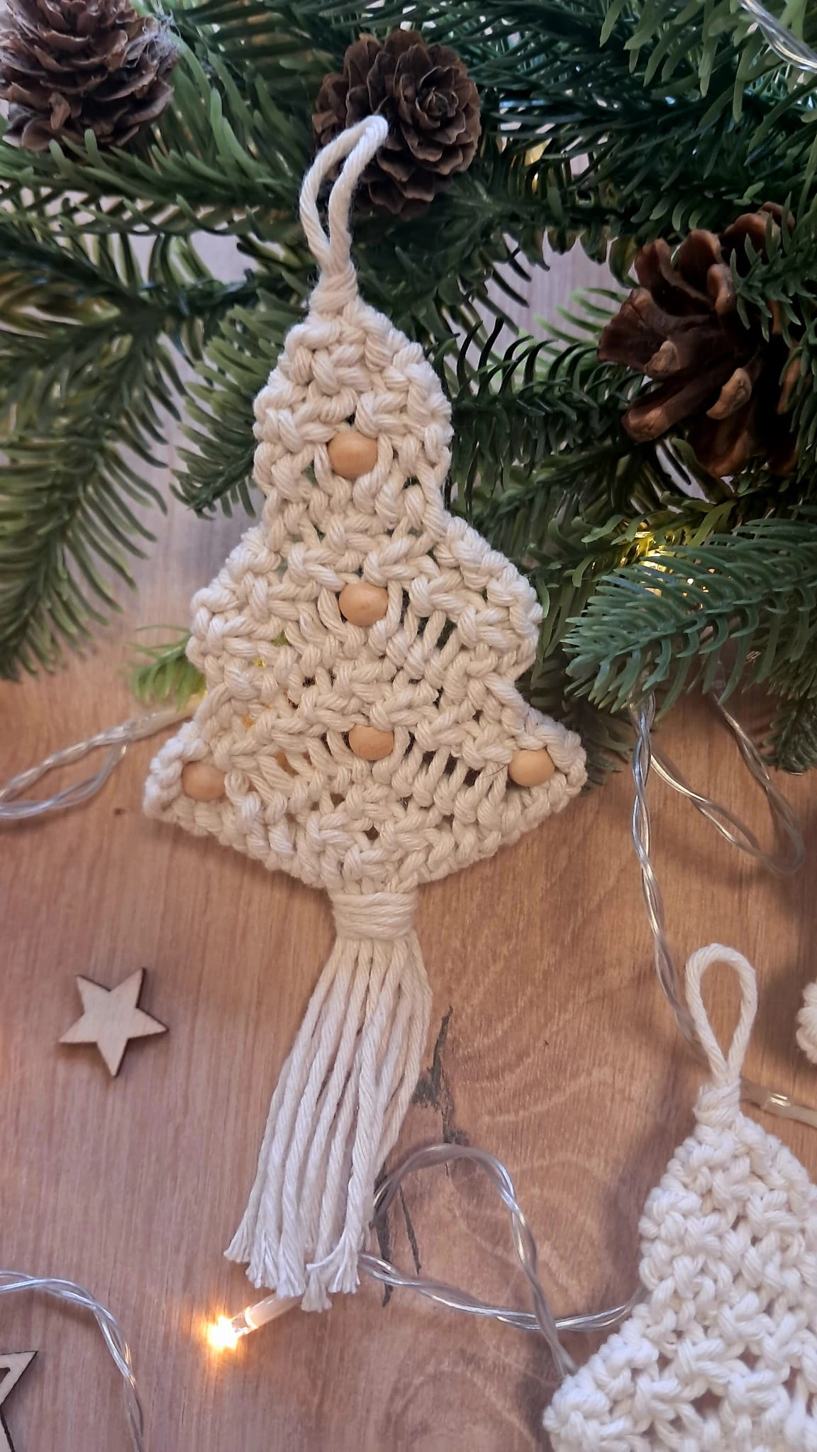 Ręcznie wykonana choinka z makramy to wyjątkowa, boho dekoracja świąteczna, która doda wnętrzu ciepła i naturalnego uroku. Pleciona z wysokiej jakości bawełnianego sznurka, świetnie sprawdzi się jako ozdoba ściany, drzwi lub prezent dla bliskiej osoby. Minimalistyczna, a jednocześnie efektown idealna na świąteczny czas.