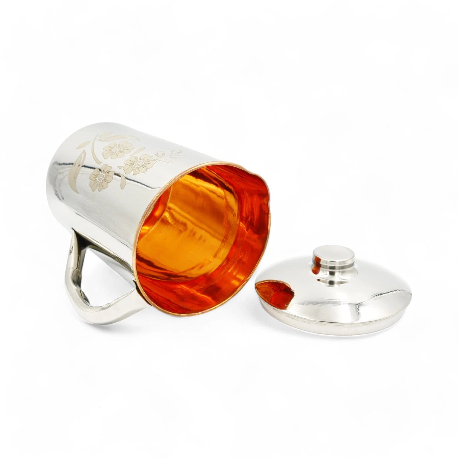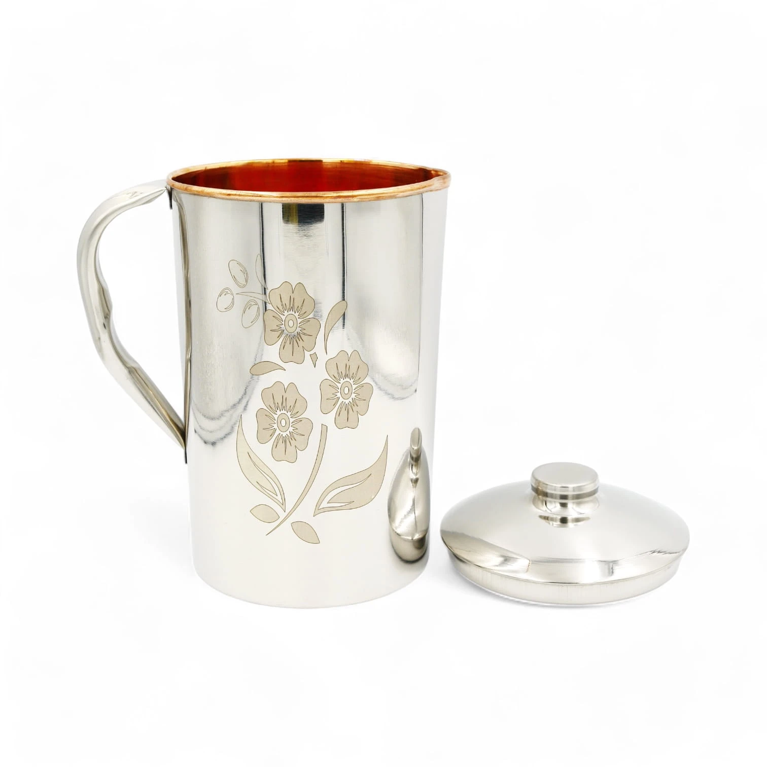 Dzbanek miedziano stalowy do nowoczesnej kuchni, w kwiatowy wzór.