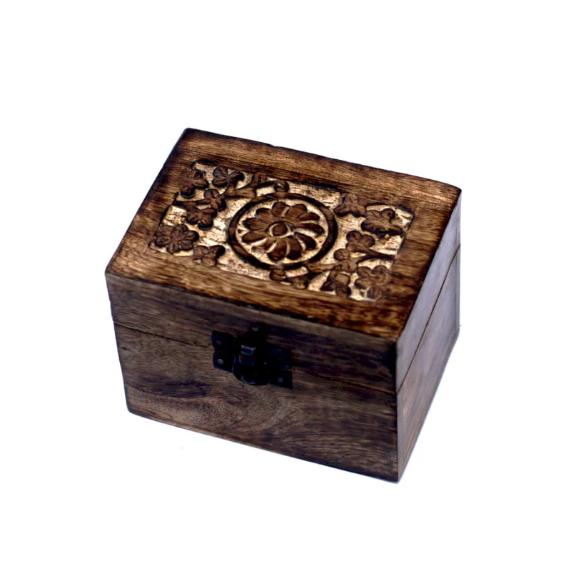 Pięknie zdobione, drewniane pudełko zmieści 6 sztuk olejków zapachowych o pojemności 10ml. Posłuży również jako oryginalna ozdoba oraz stojak np. na pędzle czy długopisy. Zamknięte pudełko rozbudza ciekawość i wyobraźnię. Wykonane z drewna mango.