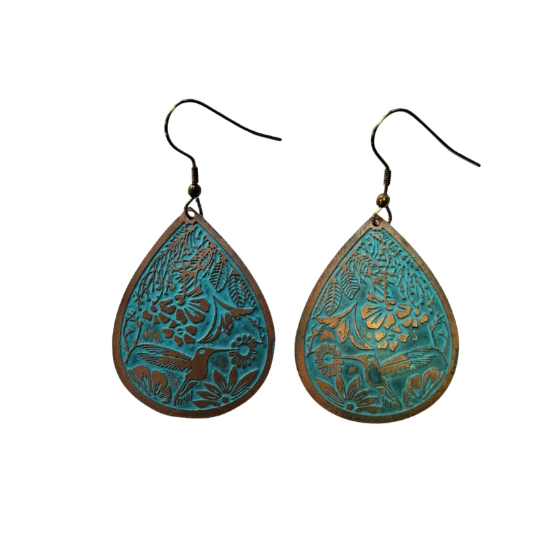 KOLCZYKI miedziane z kolibrem, patynowane