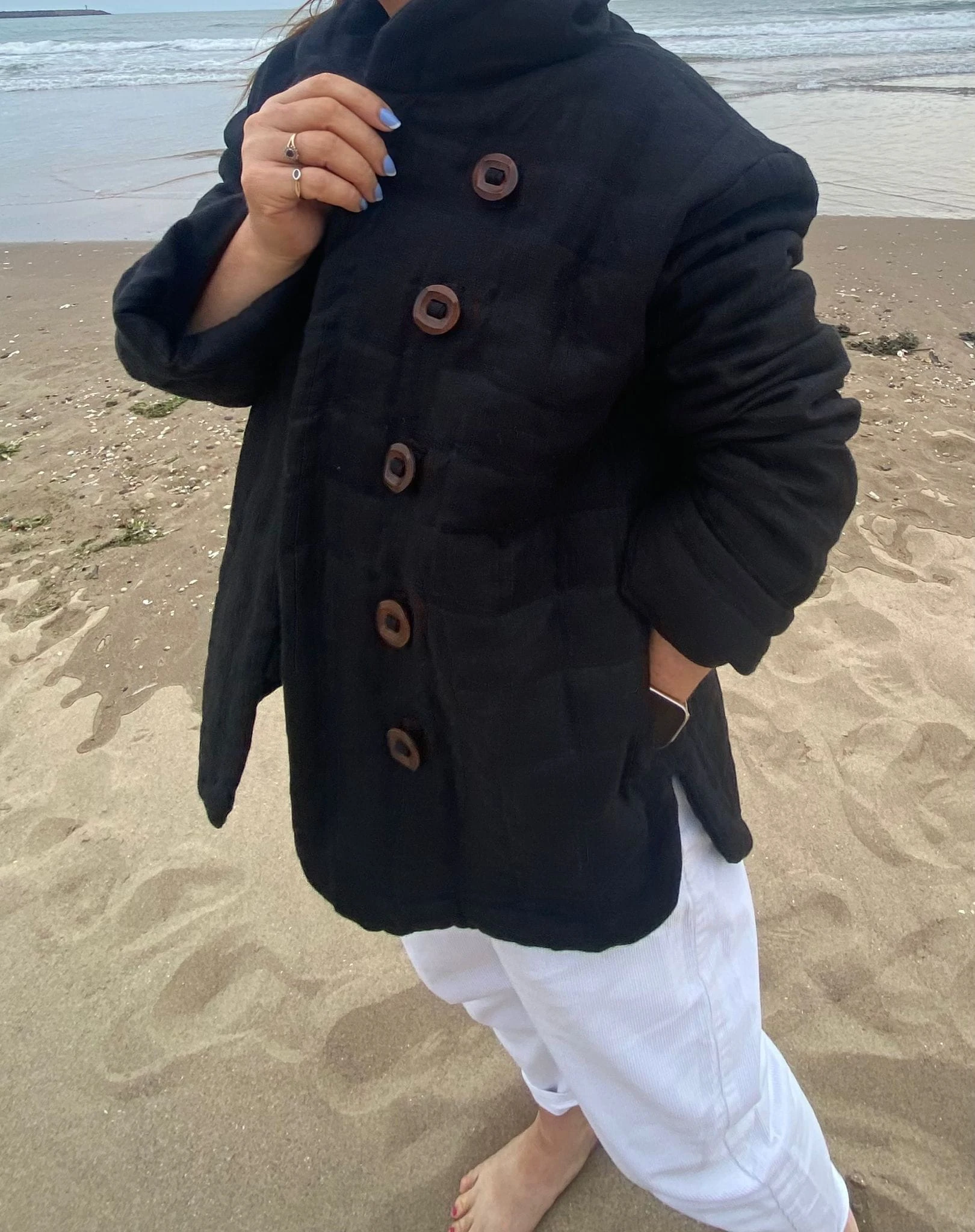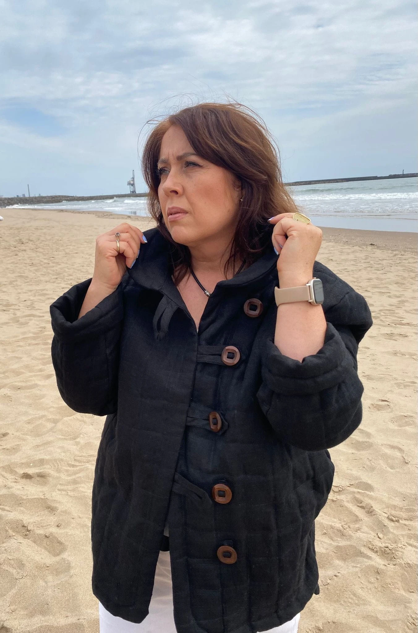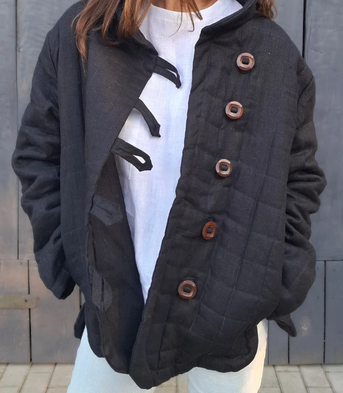 LNIANA KURTKA KUBEŁKOWA Z PIKOWANIEM, KRÓTKI PŁASZCZYK LNIANY