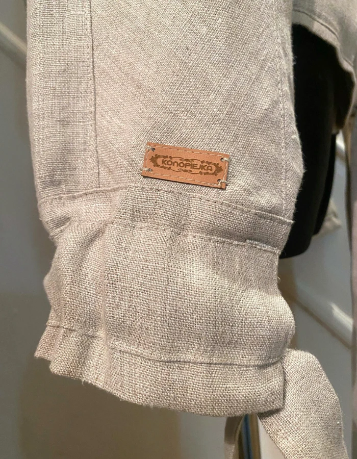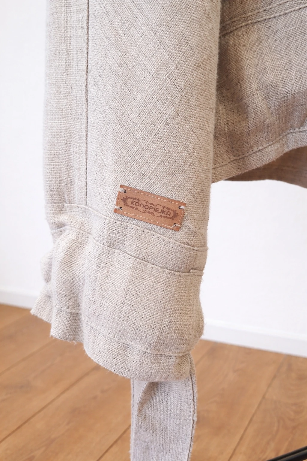 Bardzo nowoczesna w swojej formie z fantazyjnie wszytymi rękawami. Przód przypomina wszycie reglanowe, tył wszyty standardowo. Forma kurtki jest kubełkowa. Zarówno rękawy i dół kurtki mają wszyte ozdobne wiązania, dzięki czemu mamy możliwość dopasowania do indywidualnych rozmiarów. Wszystkie szwy w kurtce są podwójnie stebnowane, co dodatkowo nadaje charakteru. Szwy wewnętrzne, które mogą być widoczne podczas użytkowania zostały obszyte lamówką, która nadaje dodatkowego uroku i oryginalności, która tak bardzo cenimy w Konopiejce.