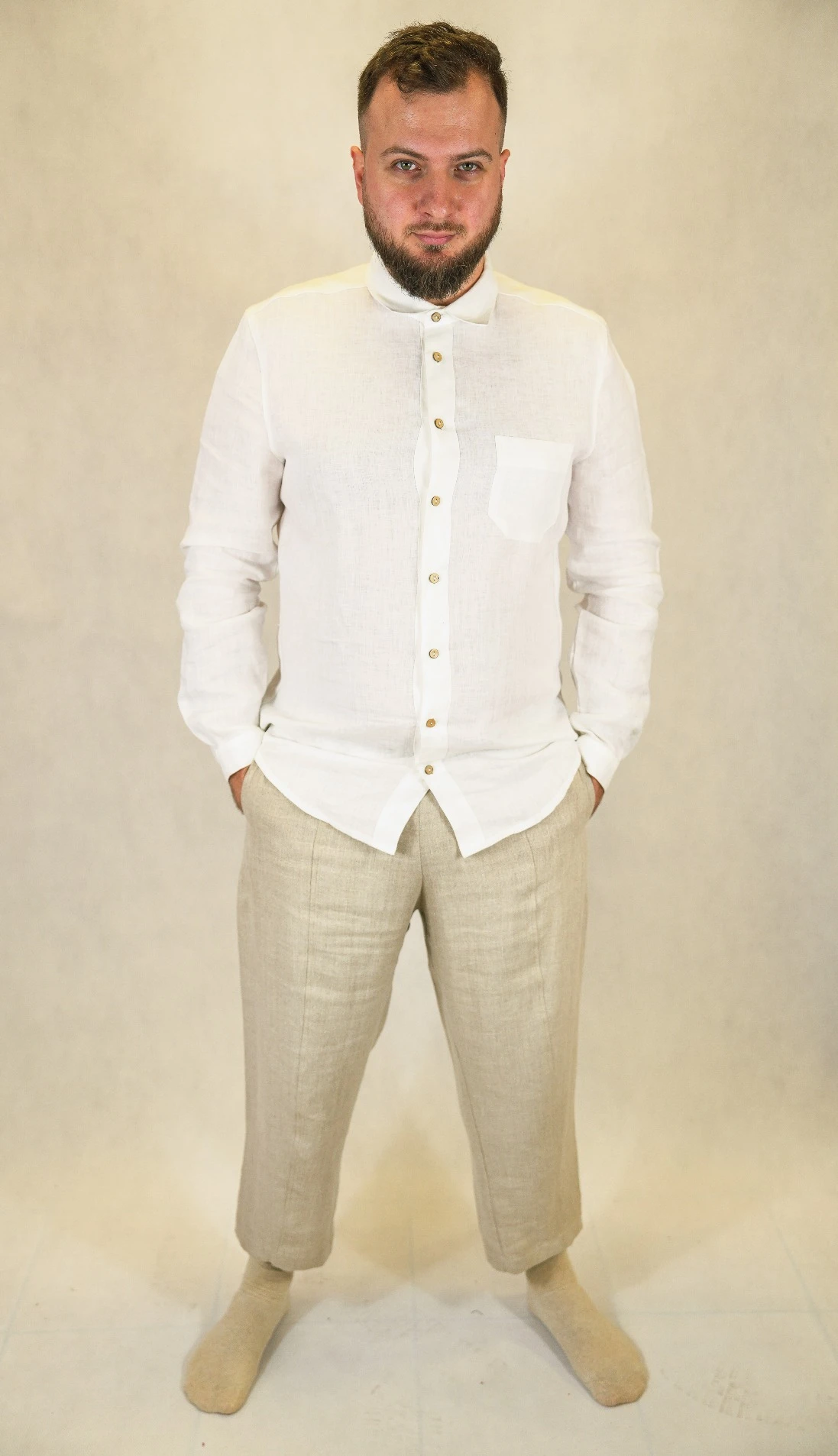 Lniana Koszula męska - Z KOŁNIERZYKIEM, biała