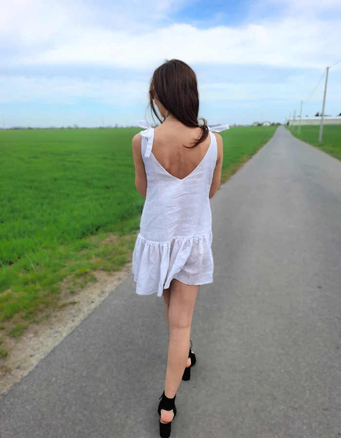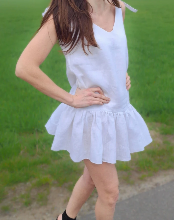 Sukienka w kolorze białym posiada lnianą podszewkę z przodu i z tyłu.