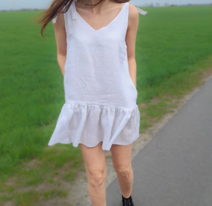Idealnie skrojona sukienka dla kobiet chcących czuć się wyjątkowo na co dzień,bądź na wakacjach,spacerując po plaży.Sukienka pasuje zarówno do trampek , jak i do sandałków. Jej miękkość można również poczuć podczas snu,używając jej jako koszuli nocnej.Dekolt z przodu i z tyłu w kształcie litery V dodaje jej uroku i zmysłowości. Niewątpliwa zaleta są regulowane ramiączka,dzięki którym można regulować głębokość dekoltu i długość sukienki.Dodatkowo sukienka posiada kieszenie. Sukienka jest miękka w dotyku,ponieważ została uszyta ze 100% zmiękczanego lnu stonewashed.