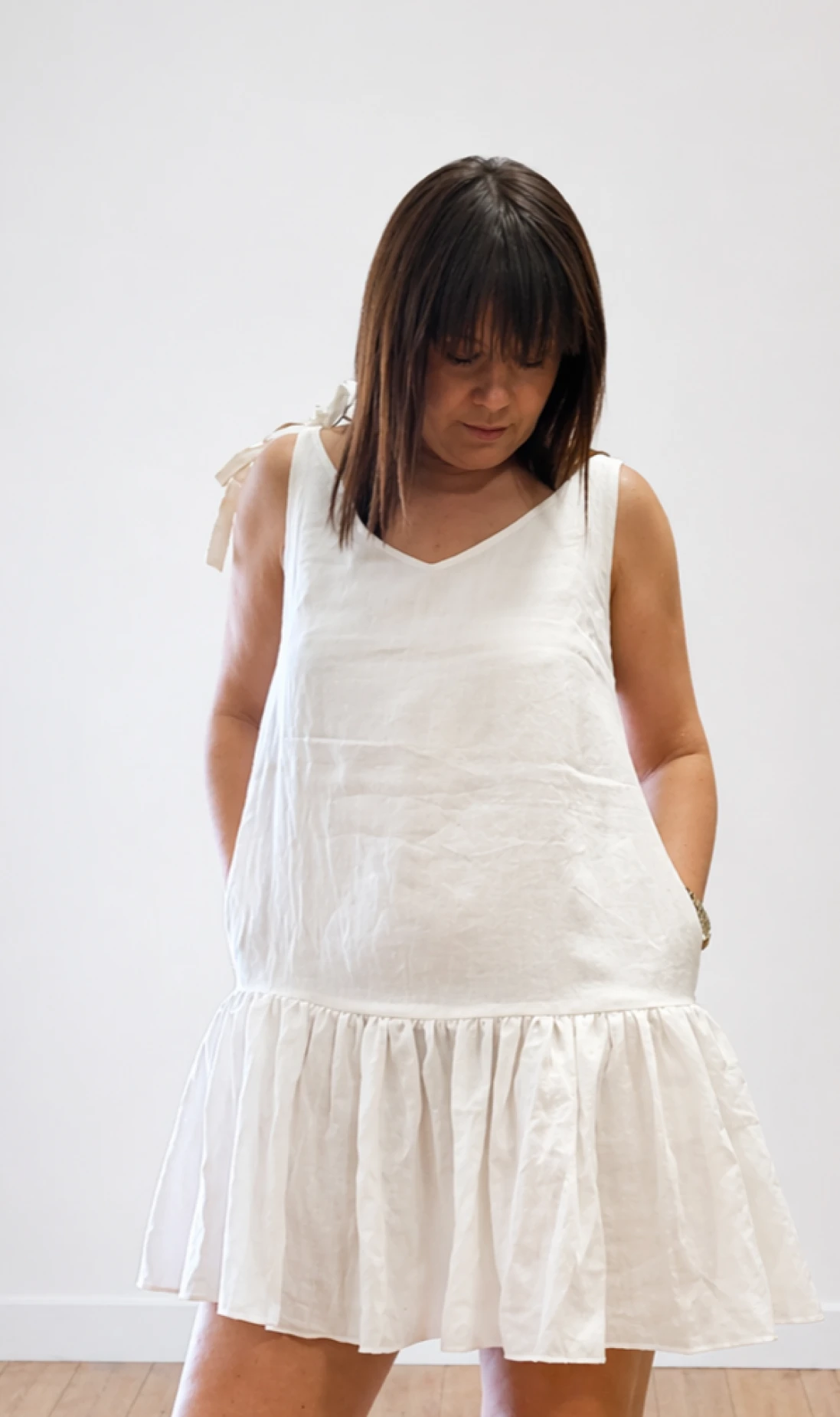Lniana Sukienka na wiązanych ramiączkach, Z FALBANAMI - biała