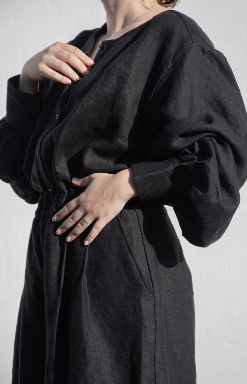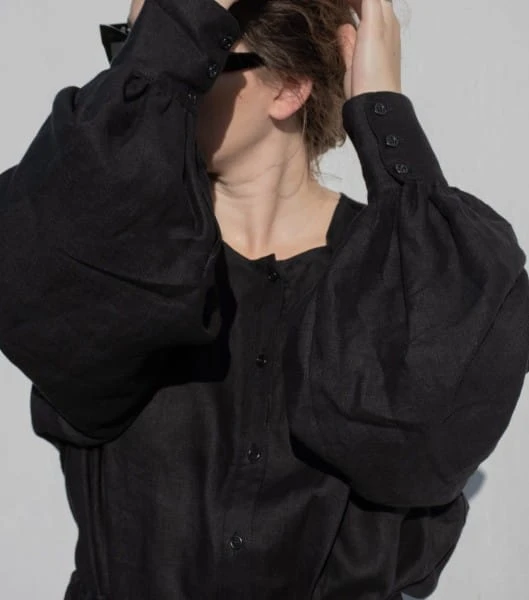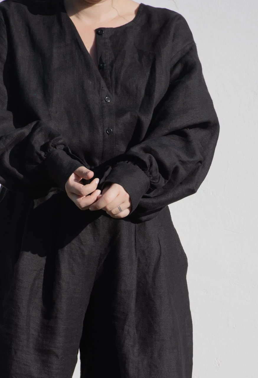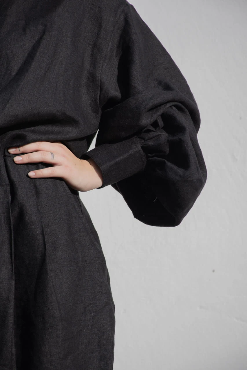 Lniana koszula damska - SZEROKIE MANKIETY ozdobne, czarna