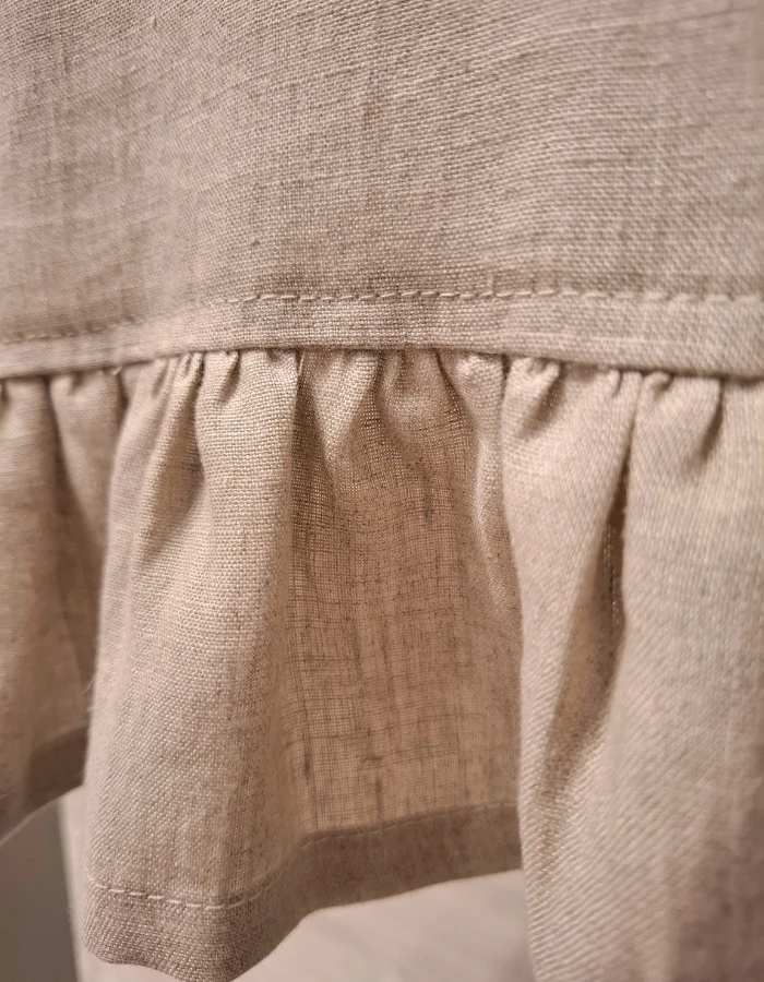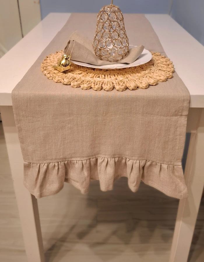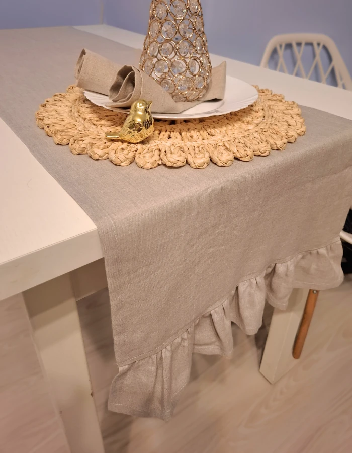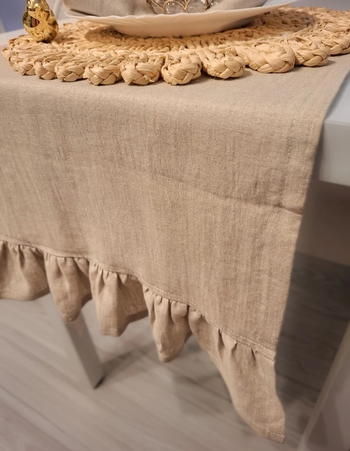 Bieżnik lniany naturalny beż z falbana to stylowy dodatek na Twój stół. Uszyty został z lnu stonewashed, co sprawia, że jest miękki i pięknie układa się na stole. Bieżnik można układać bezpośrednio na stole lub na obrusie lnianym, co stanowić będzie dodatkową dekorację. Do bieżnika możesz dobrać inne produkty lniane, takie jak: obrus lniany lub podkładki pod talerz.