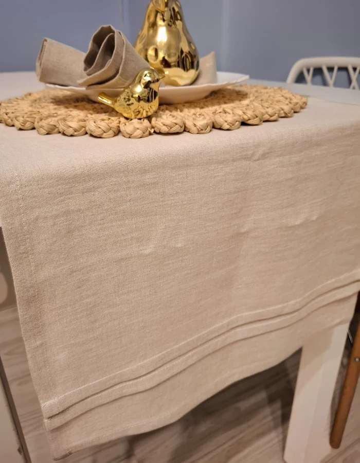 Bieżnik lniany naturalny beż z plisami to stylowy dodatek na Twój stół. Uszyty został z lnu stonewashed, co sprawia, że jest miękki i pięknie układa się na stole. Bieżnik można układać bezpośrednio na stole lub na obrusie lnianym, co stanowić będzie dodatkową dekorację. Do bieżnika możesz dobrać inne produkty lniane, takie jak: obrus lniany lub podkładki pod talerz.