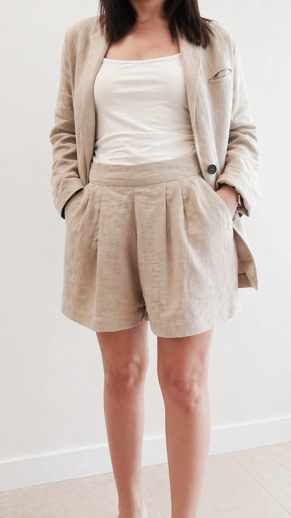 Lniany Garnitur Damski - MARYNARKA + SPODENKI, naturalny
