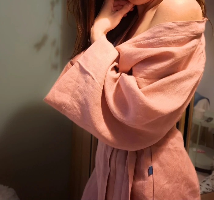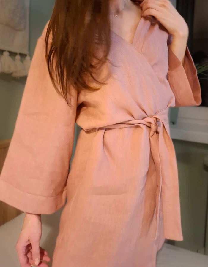Szlafrok z lnu w pięknym odcieniu różu uszyty został ze 100% lnu typu stonewashed. Tkanina jest delikatna i miękka w dotyku. Szlafrok wspaniale się nosi, daje swobodę ruchu, przy tym jest bardzo kobiecy. Wspaniale sprawdzi się w każdej porze roku, dzięki naturalnym właściwościom termoregulacji. Ponadto len świetnie wchłania wodę, dlatego sprawdzi się do okrycia wilgotnego ciała zaraz po kąpieli.