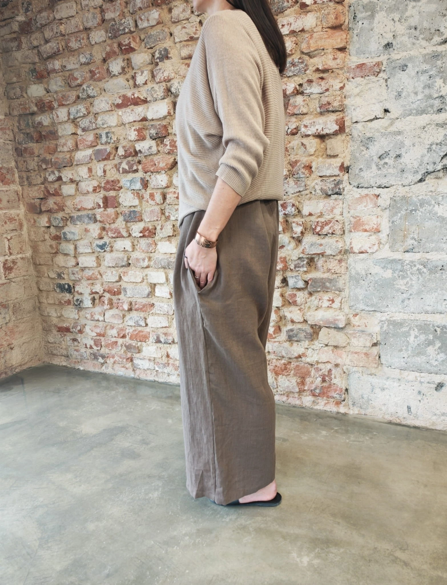 Model posiada kieszenie ukryte w szwach bocznych, dzięki czemu pozostaje minimalistyczny i funkcjonalny jednocześnie.