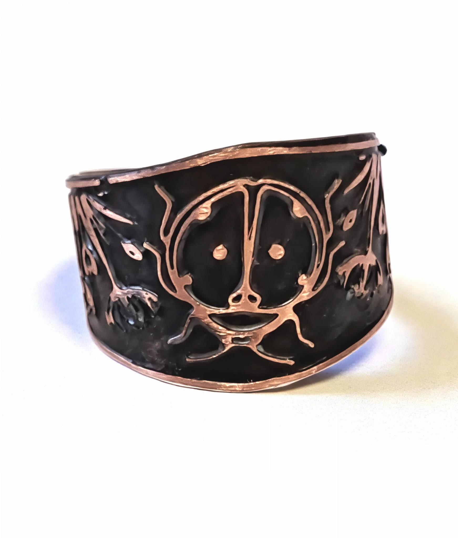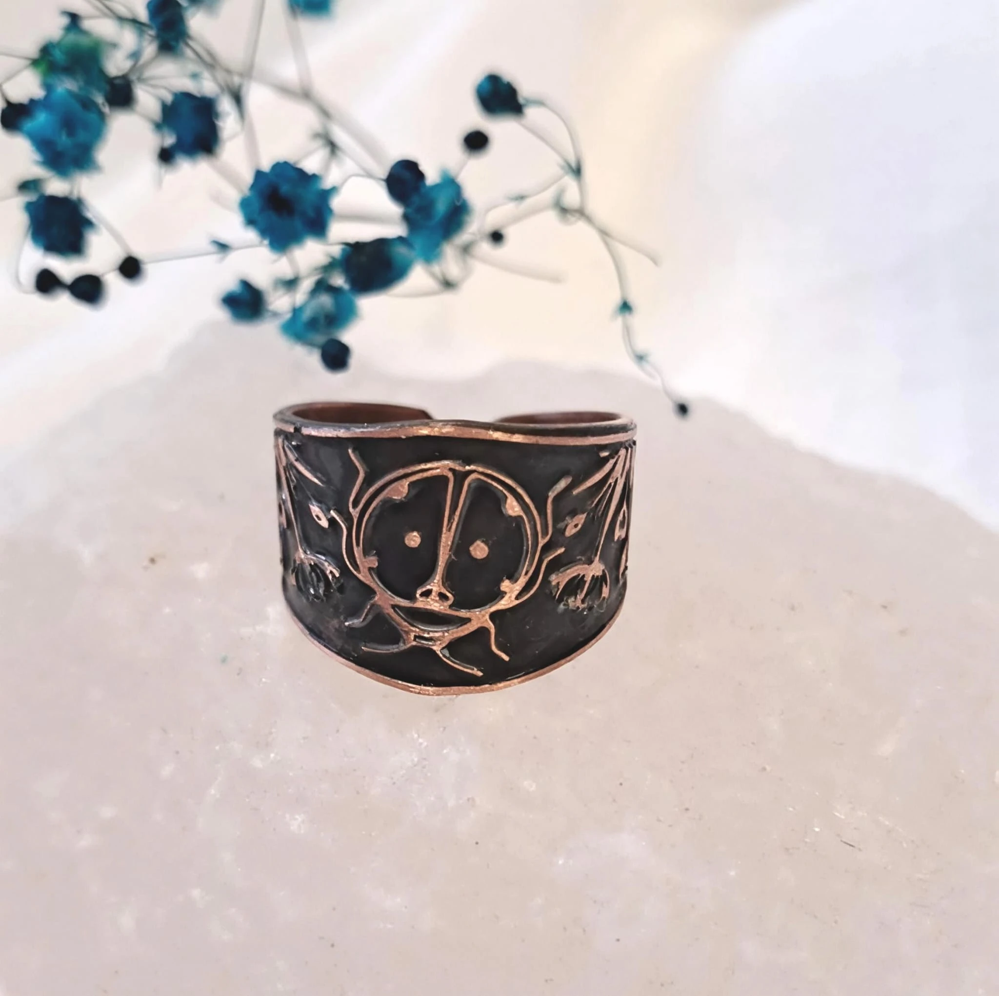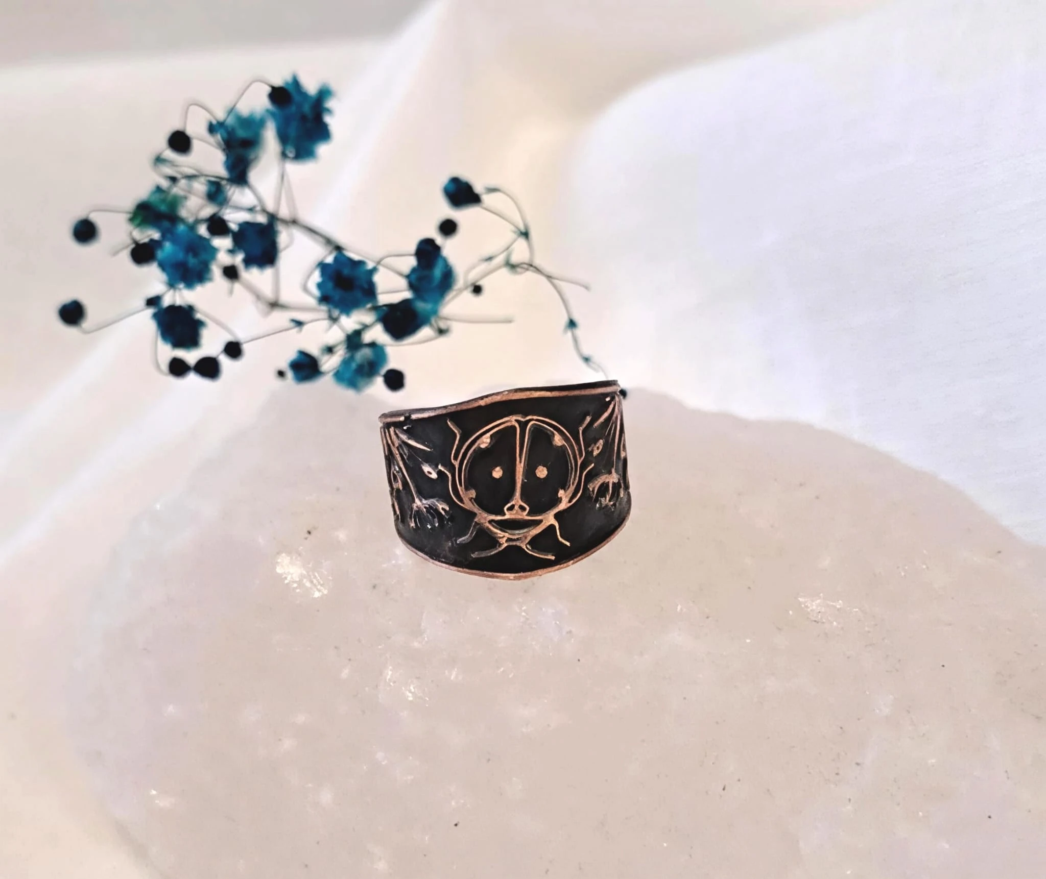 Ręcznie wykonany pierścionek miedziany z pięknym, ręcznie wykonanym wzorem biedronki na czarnym tle.Czarna patyna powoduje uwydatnienie wzoru.