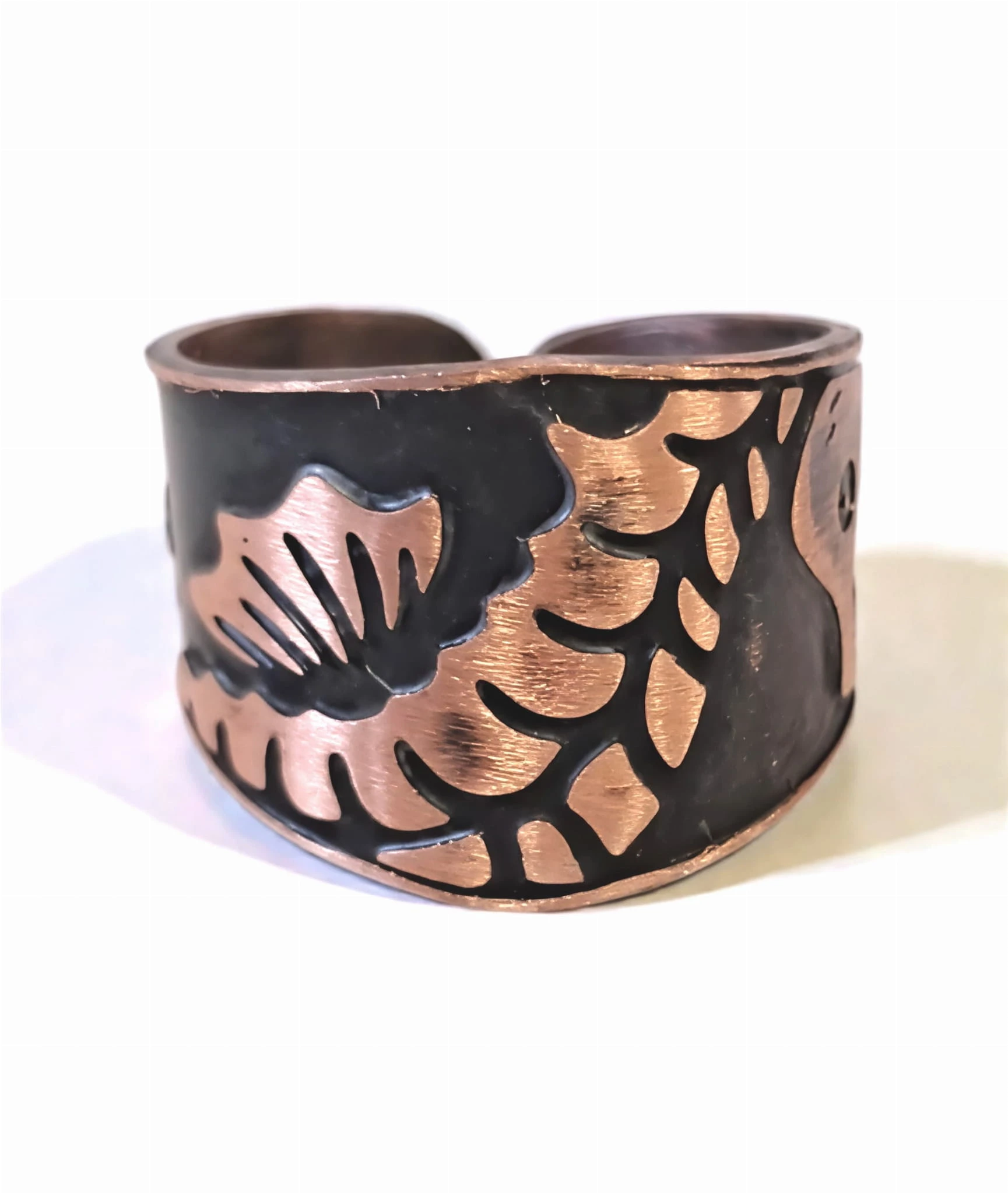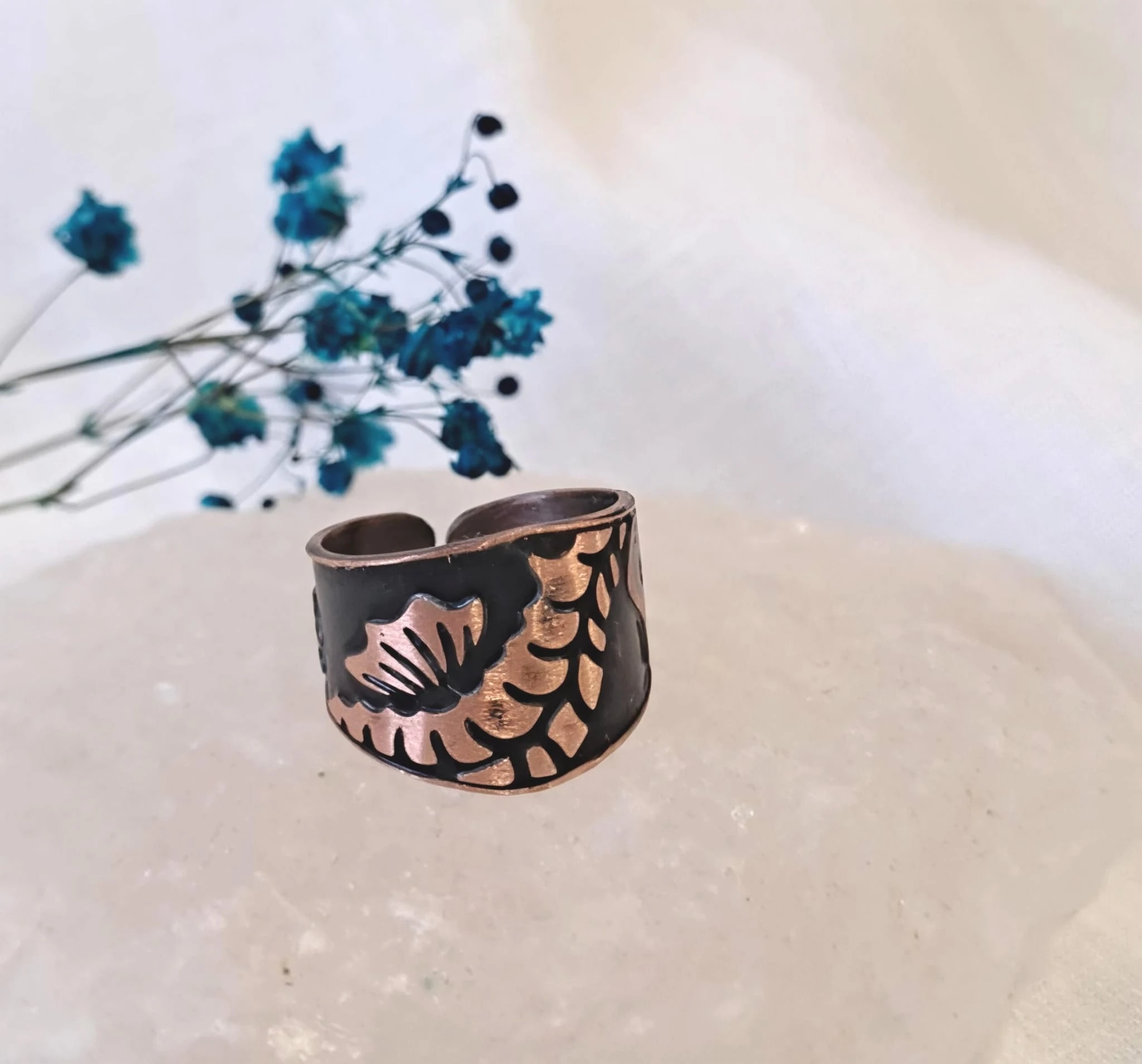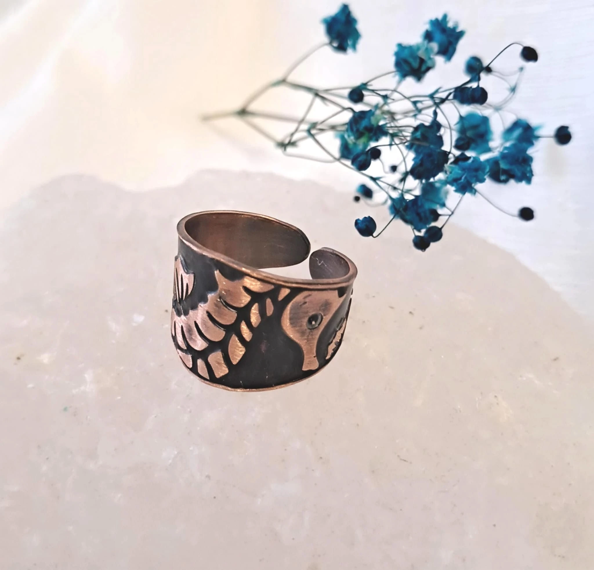 Ręcznie wykonany pierścionek miedziany z pięknym, ręcznie wykonanym wzorem konika morskiego na czarnym tle.Czarna patyna powoduje uwydatnienie wzoru.