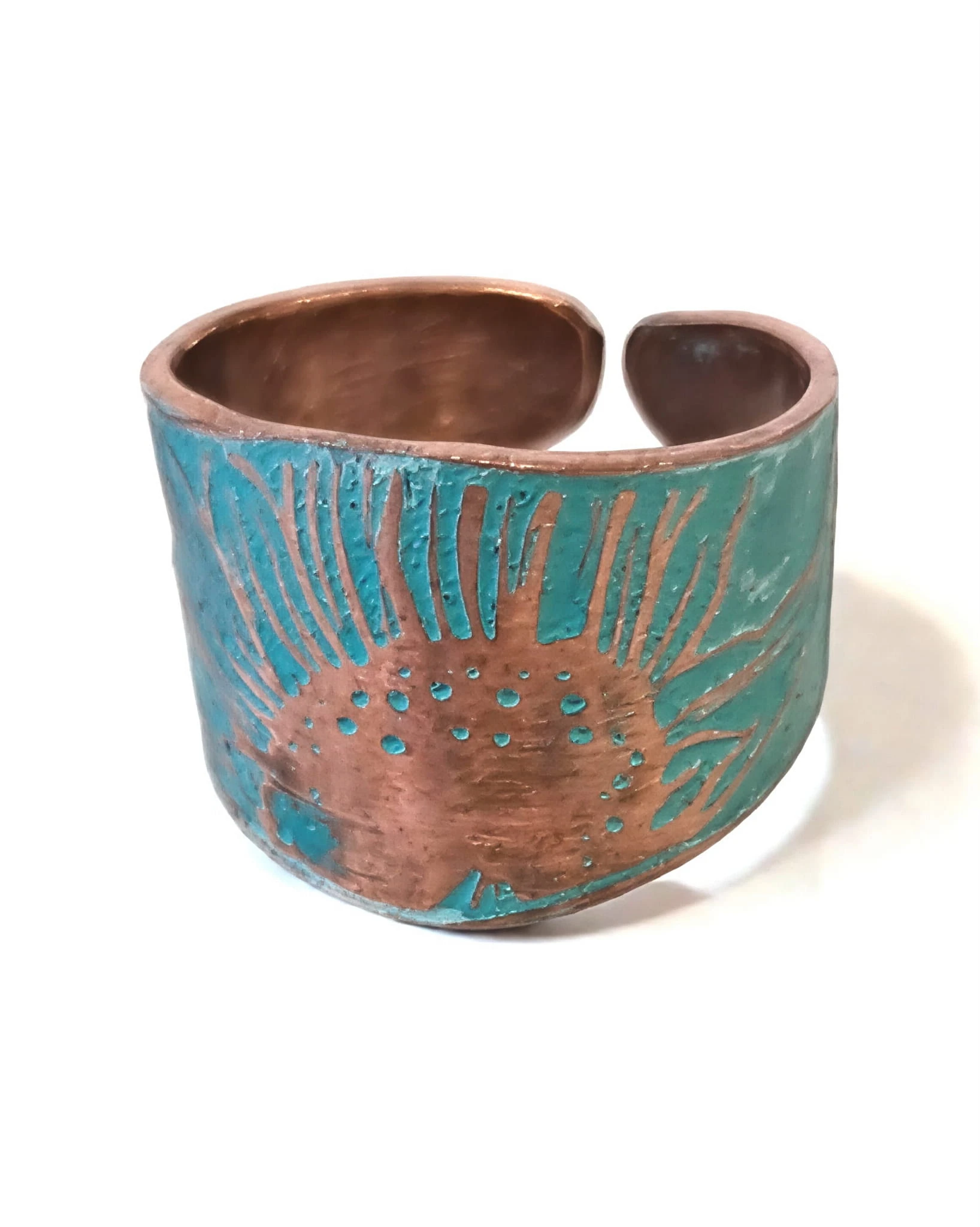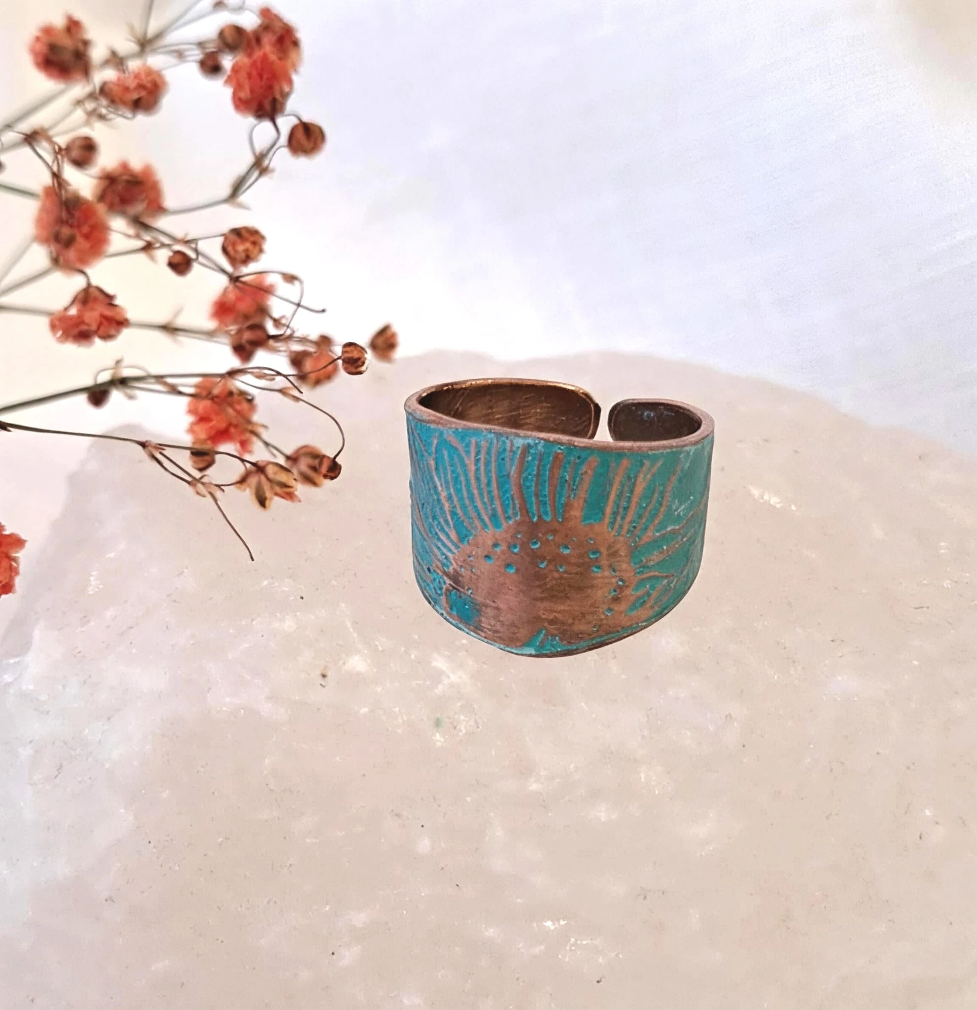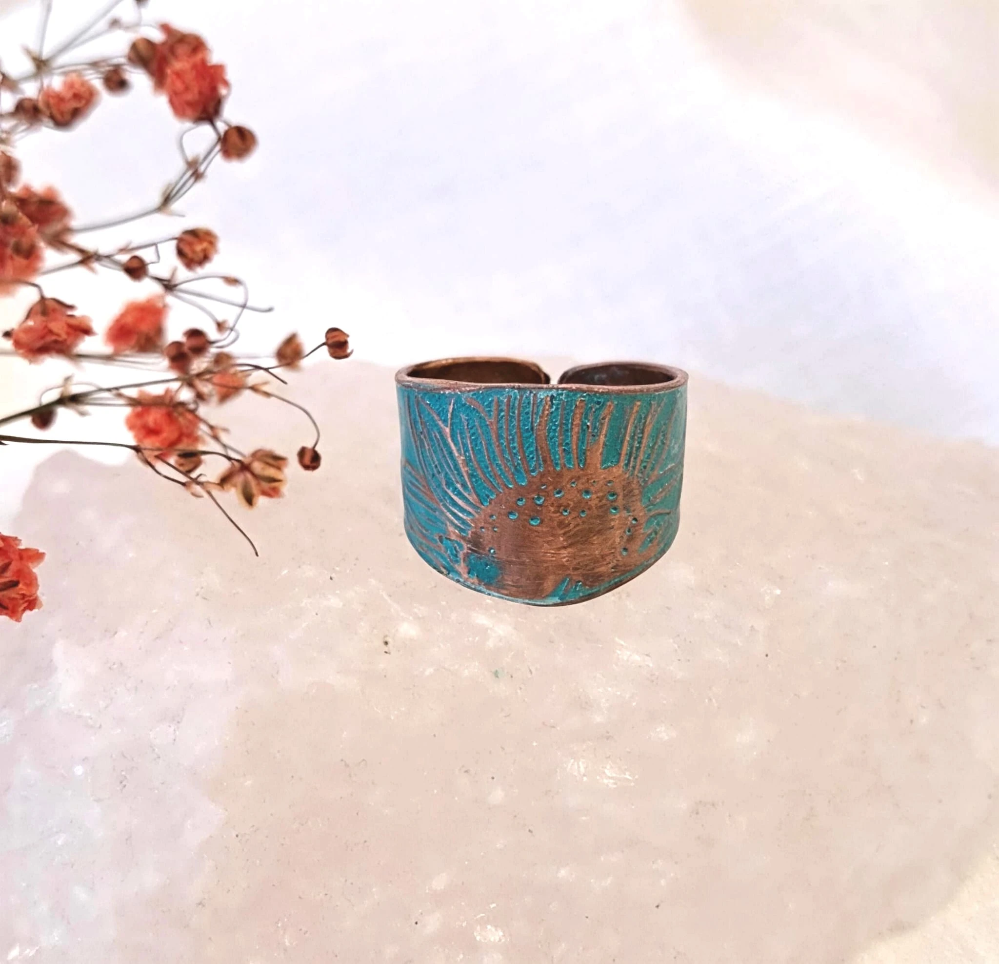 Ręcznie wykonany pierścionek miedziany z pięknym, ręcznie wykonanym wzorem słonecznika. Delikatna, jasnoniebiesko patyna powoduje uwydatnienie wzoru. Rozmiar jest uniwersalny i można je regulować przez delikatne zgięcie.