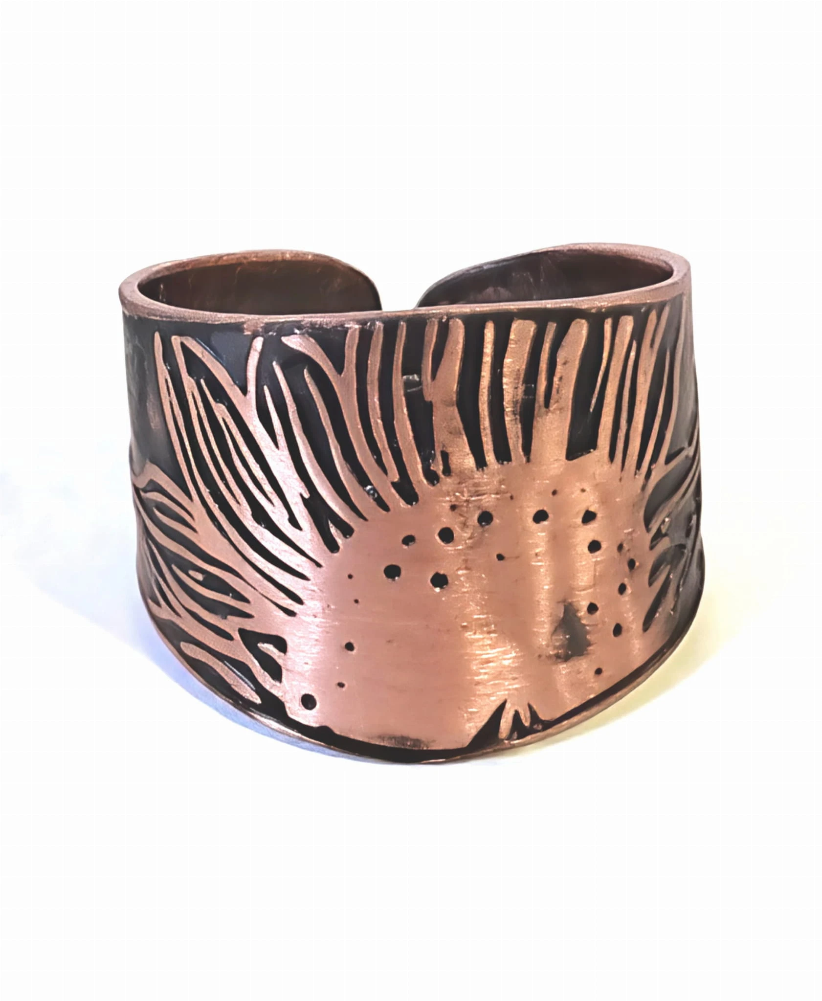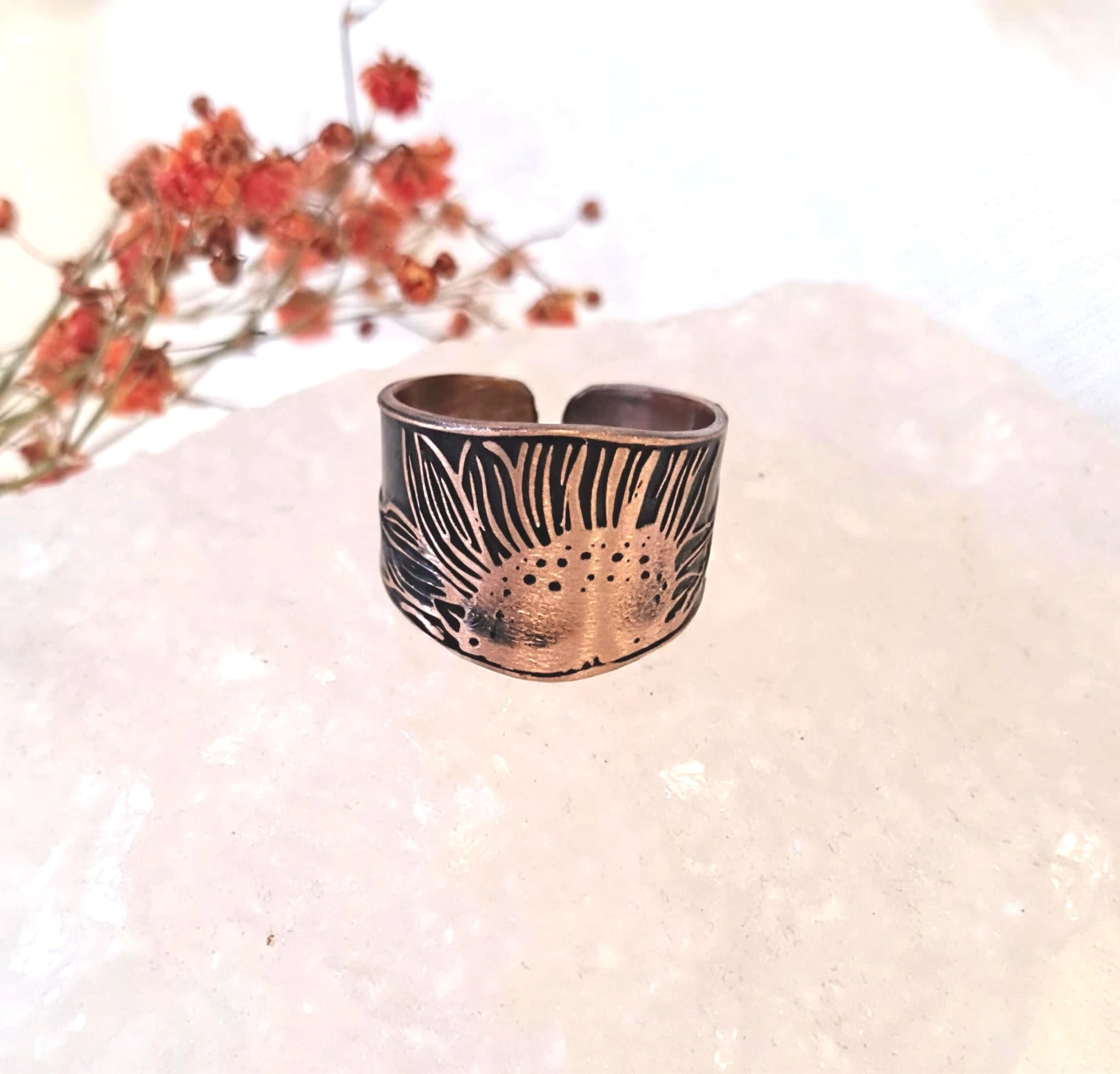 Ręcznie wykonany pierścionek miedziany z pięknym, ręcznie wykonanym wzorem słonecznika na czarnym tle.Czarna patyna powoduje uwydatnienie wzoru.