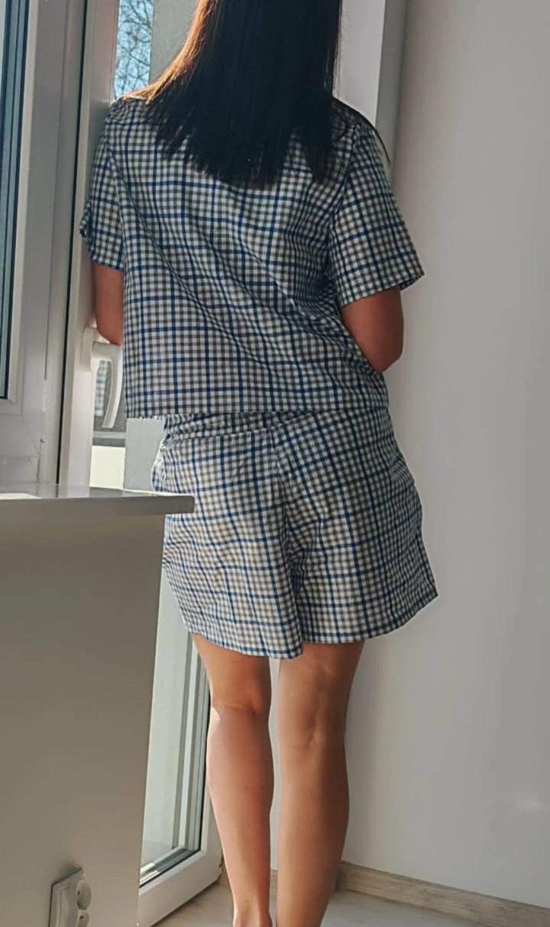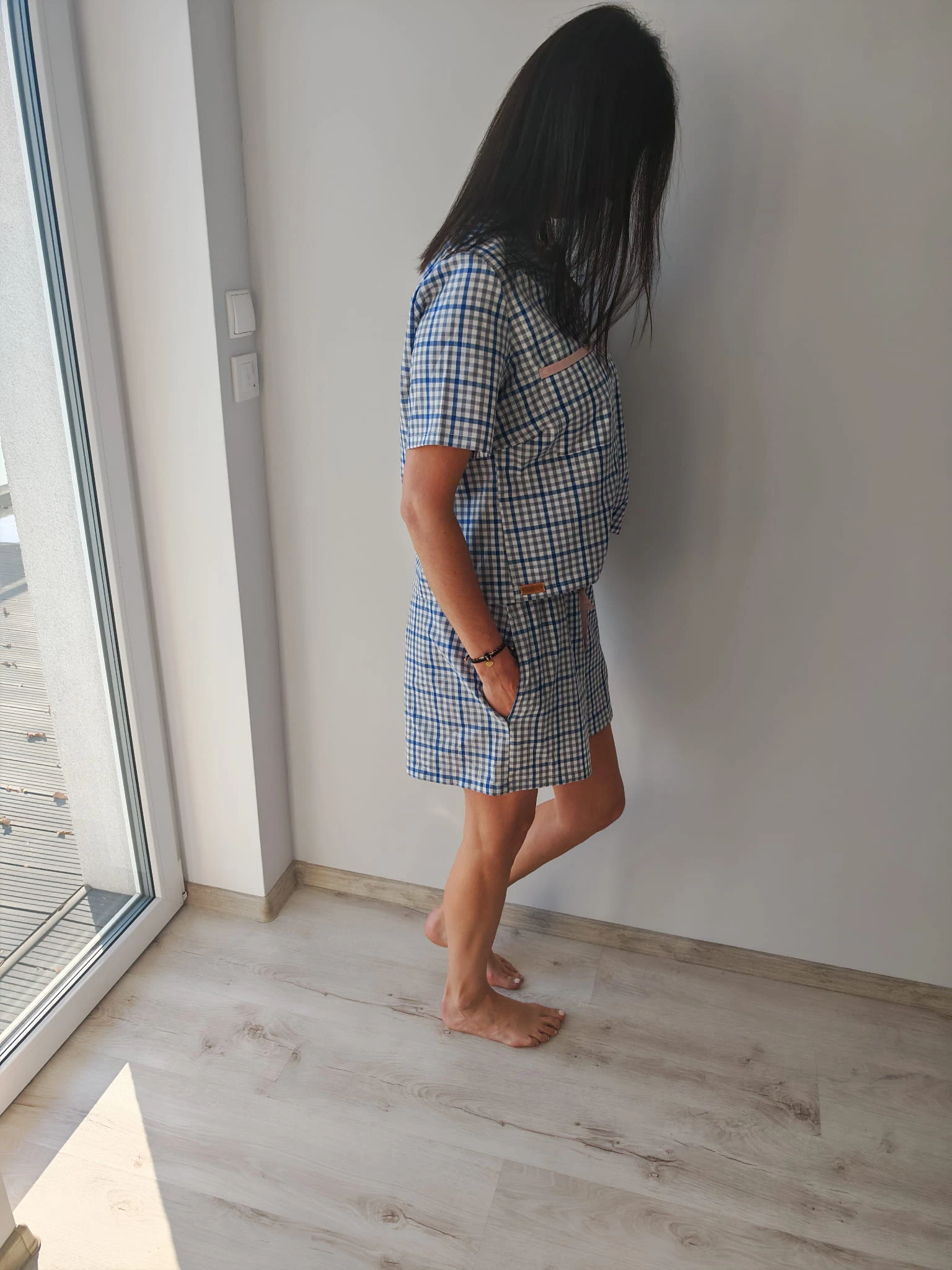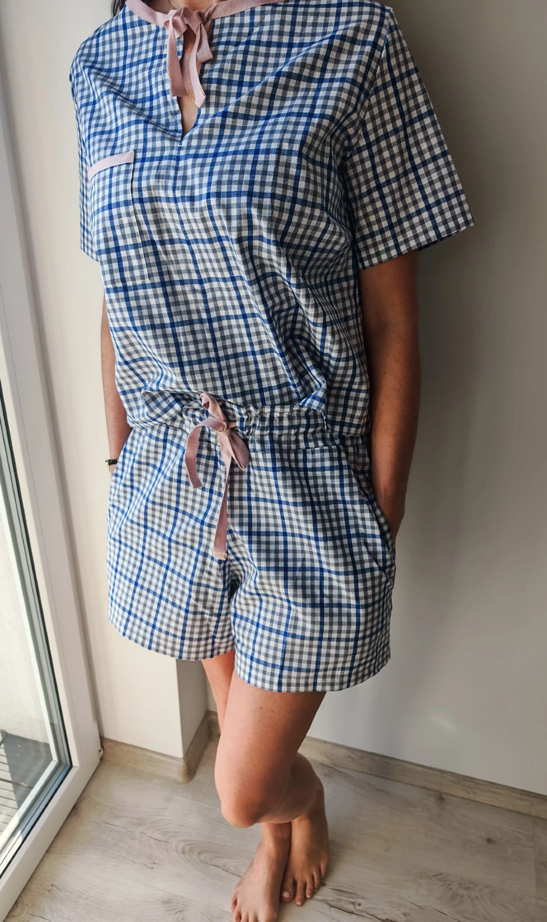 Piżama damska z tkaniny lniano-bawełnianej w kratkę biało-niebieska