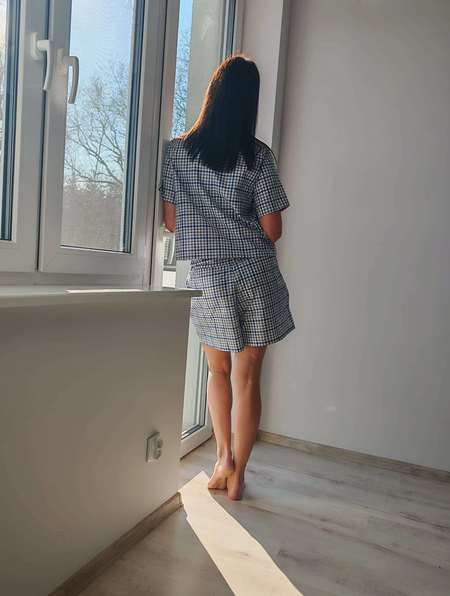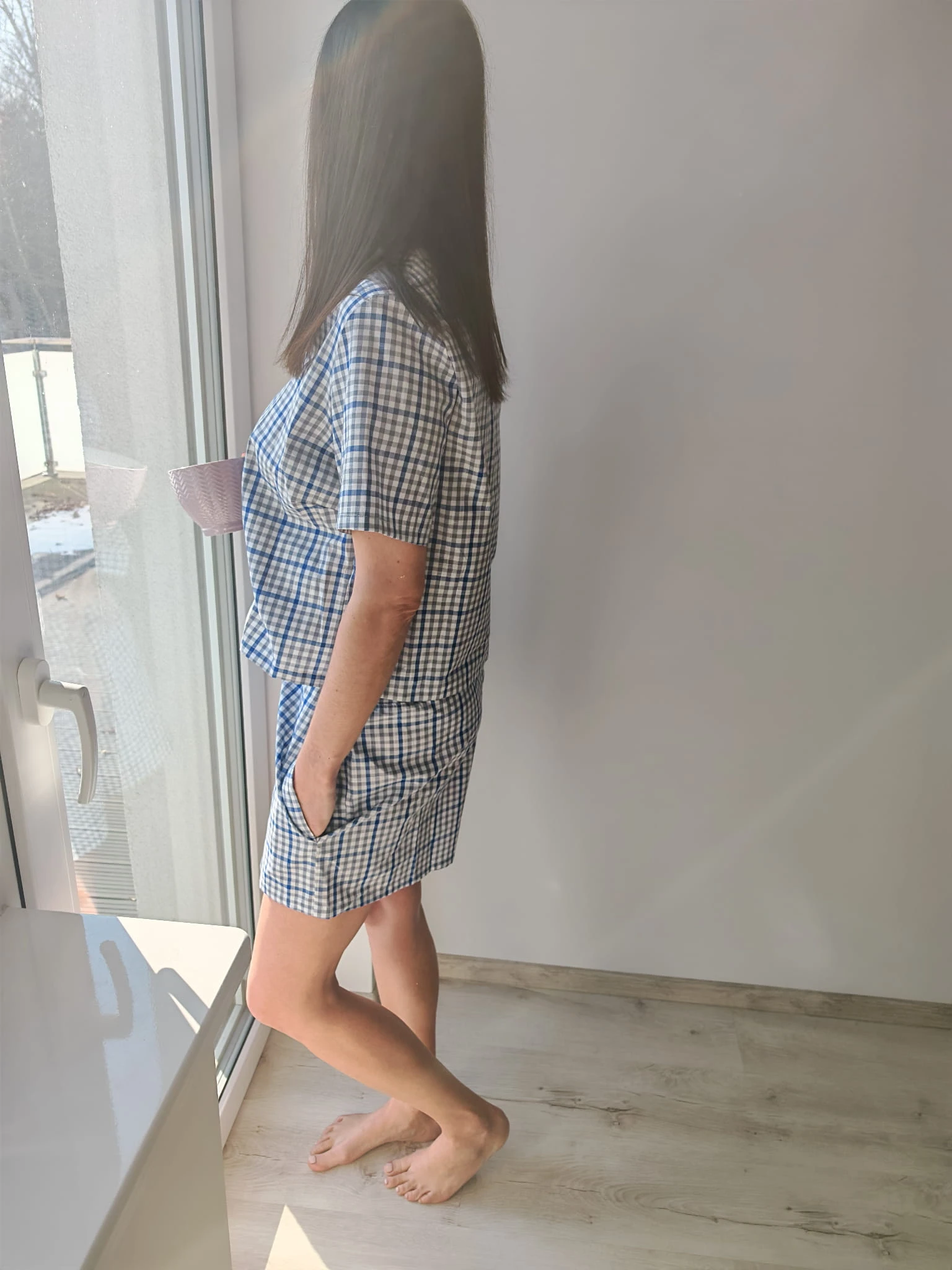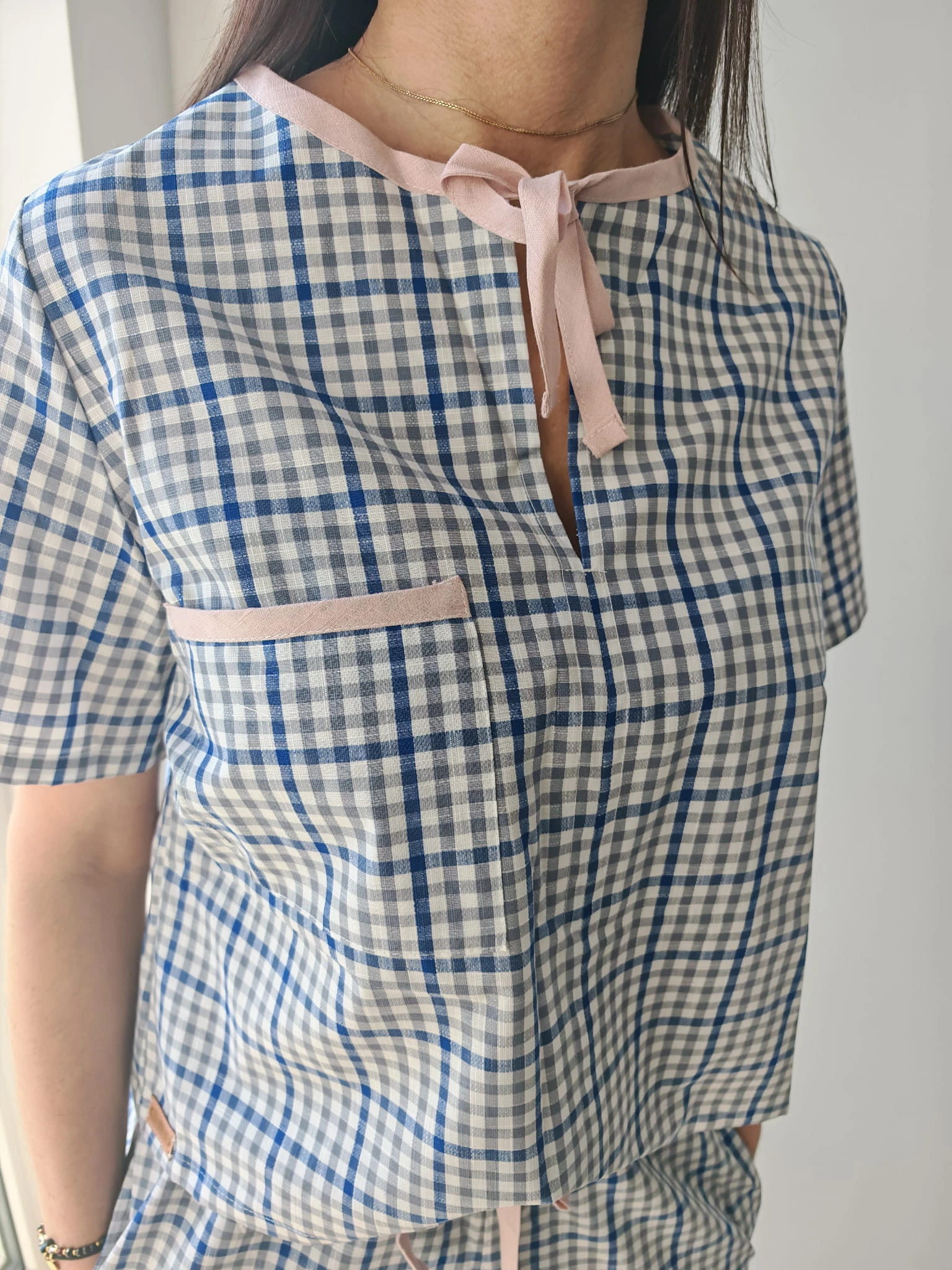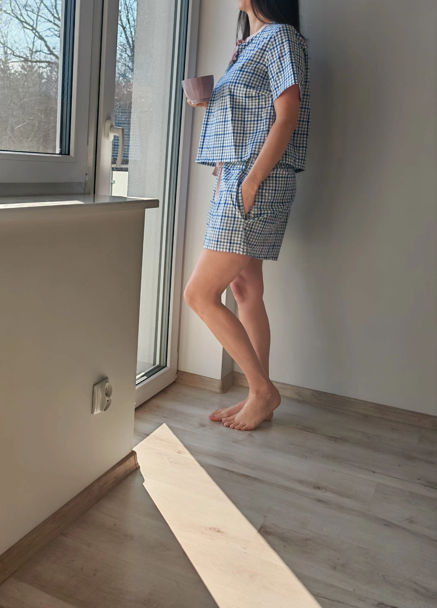 Piżama damska z tkaniny lniano-bawełnianej w kratkę biało-niebieska