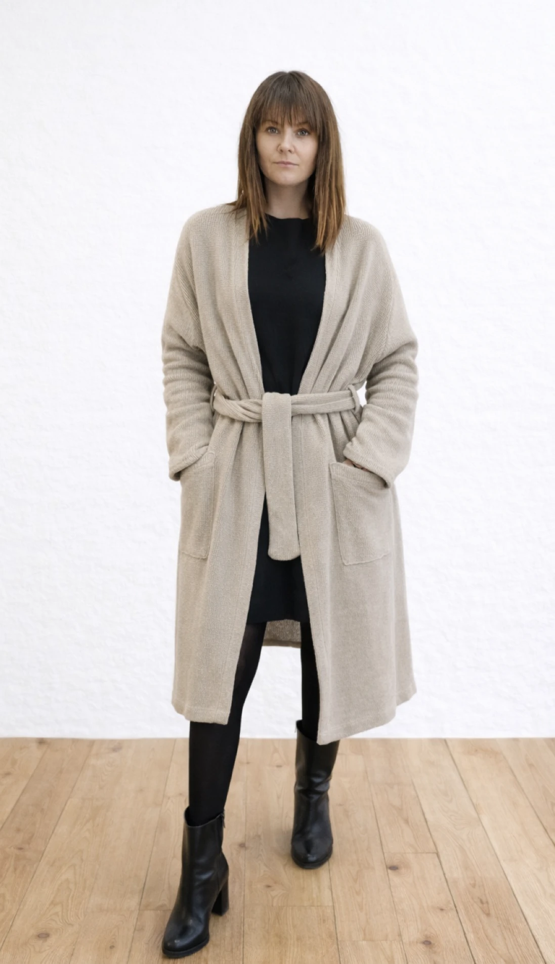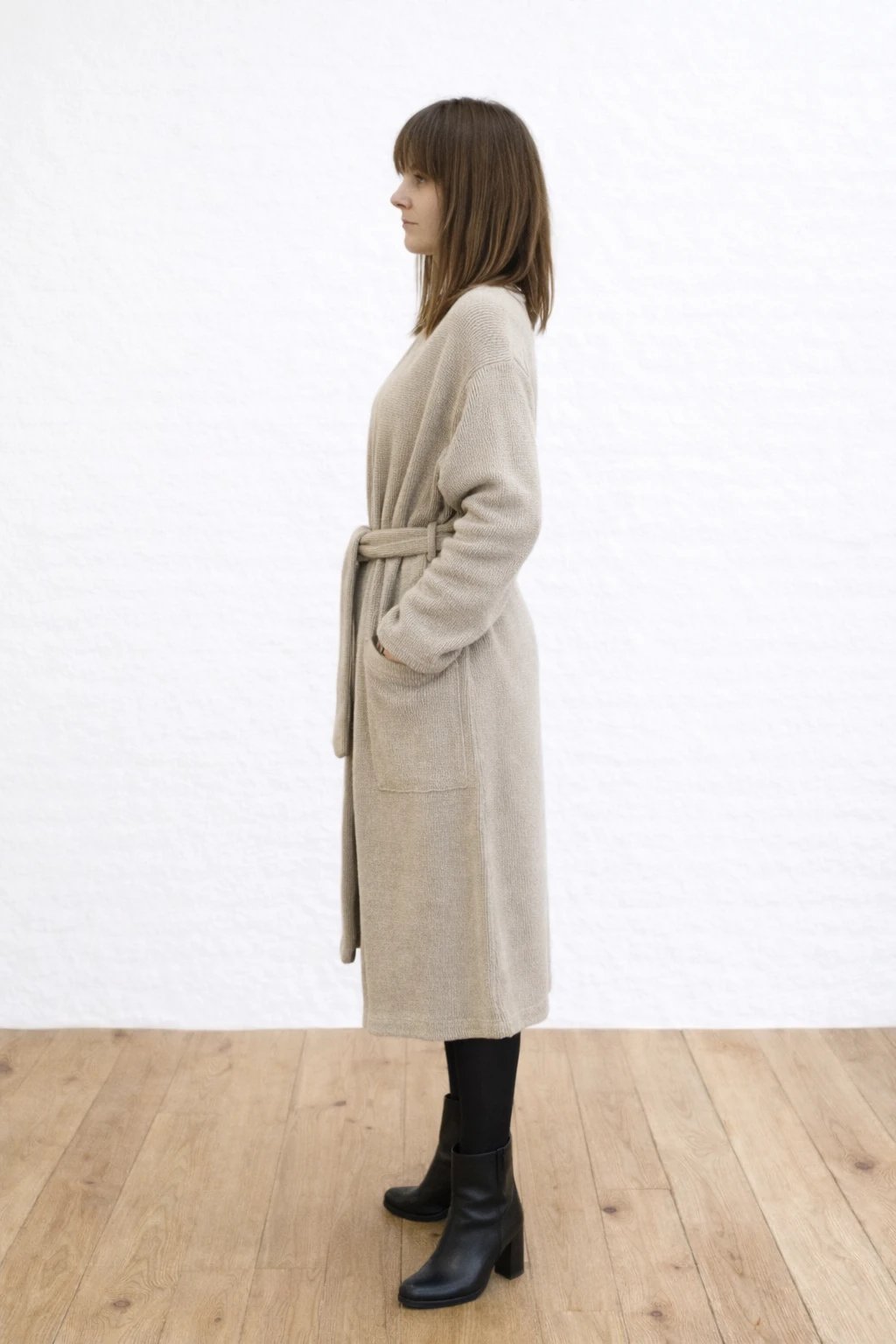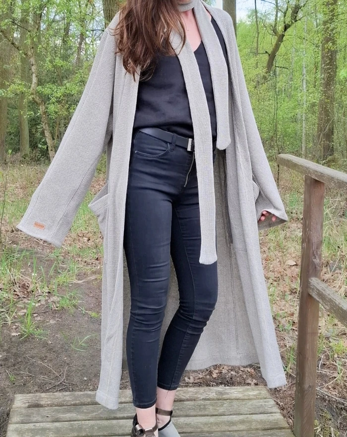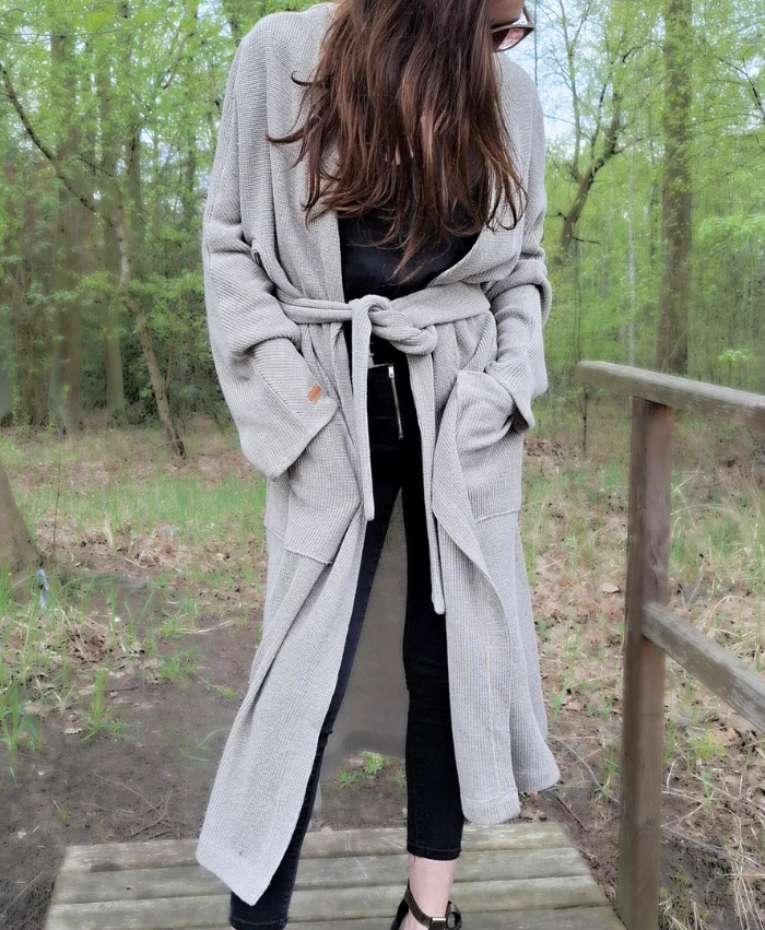 Kardigan uszyty z dzianiny 100% lnianej dwułożyskowej, bardzo mięsistej i plastycznej. Bardzo nowoczesny w formie, a jednocześnie mocno elegancki i wyjątkowy. Nowoczesna forma wszycia rękawa, pozwala ukazać wyjątkowy splot dzianiny, a jednocześnie daje możliwość lepszego dopasowania do sylwetki. Przód wszycia rękawa - forma "reglanu" , tył został wszyty w tradycyjny sposób. Kardigan/płaszcz posiada dwie głębokie kieszenie oraz pasek, dzięki któremu łatwiej dopasować szlafrokową formę. Rękawy nieco rozkloszowane, zakończone dzianinową, lnianą lamówką.