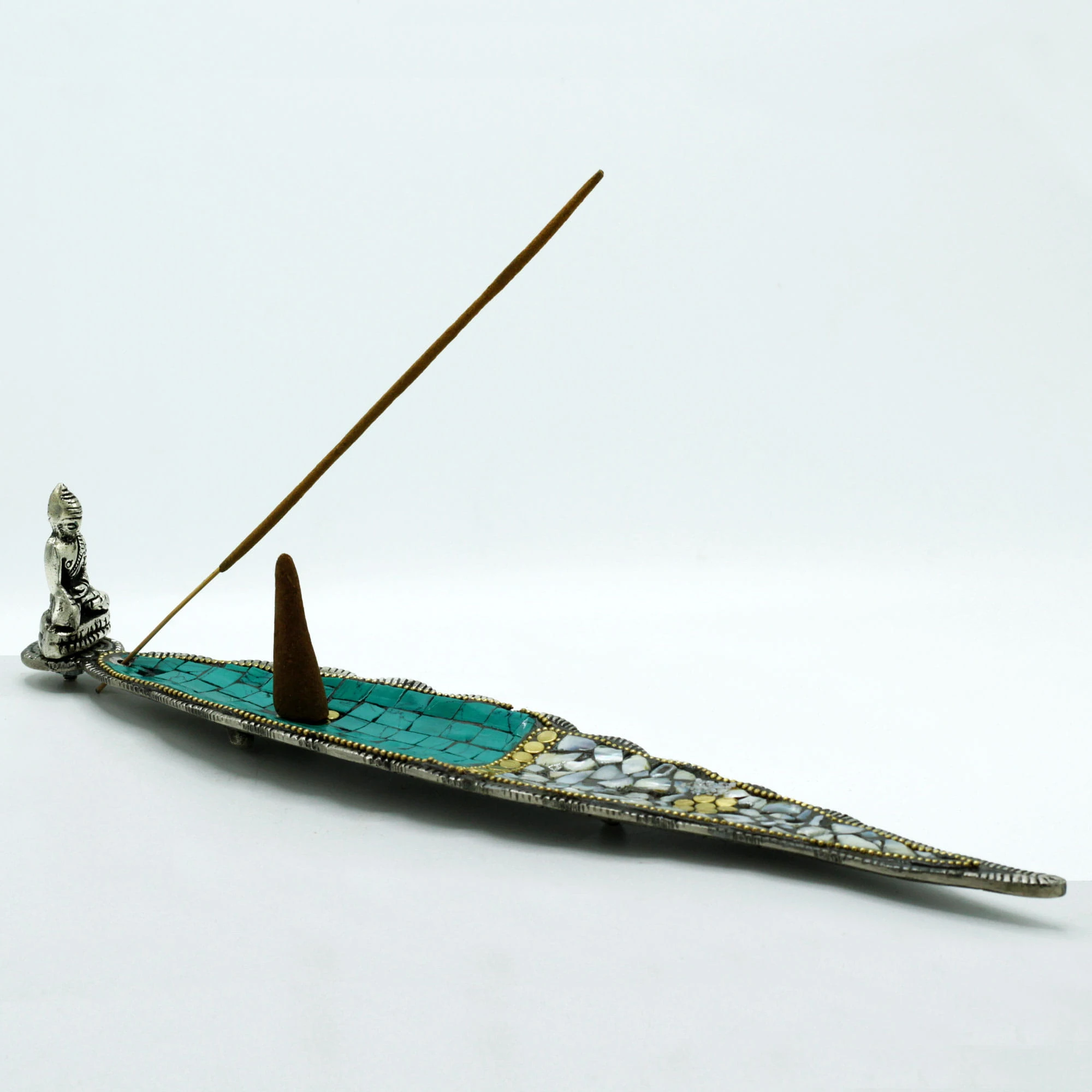 Ta zachwycająca tybetańska podstawka pod kadzidełka w kształcie długiego liścia z figurką Buddy emanuje spokojem i harmonią. Wykonana z metalu i ozdobiona misterna mozaiką z motywami tybetańskimi, z pewnością stanie się centralnym punktem każdego wnętrza, dodając mu orientalnego charakteru.