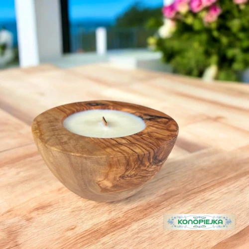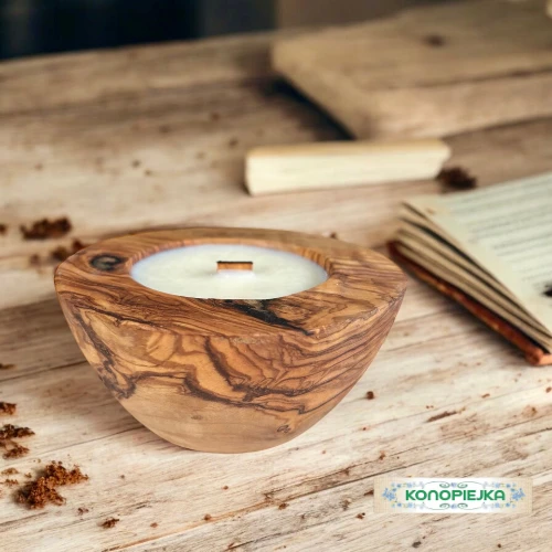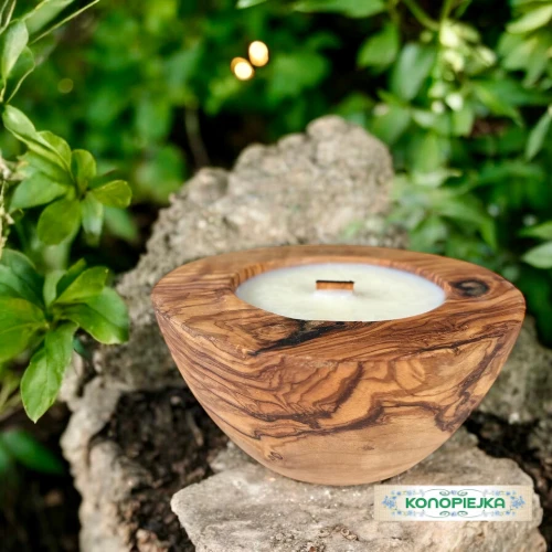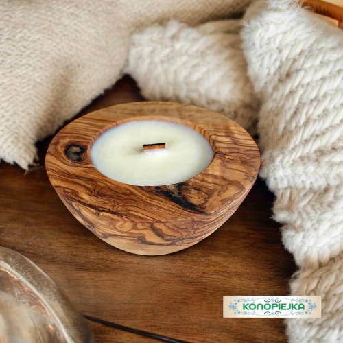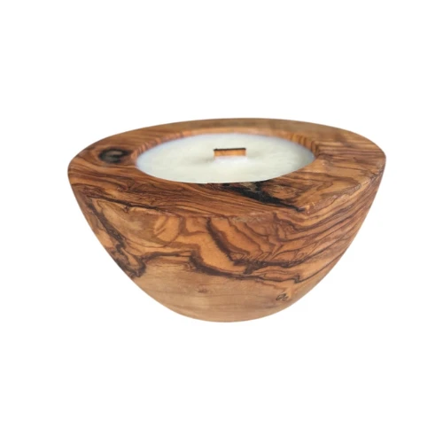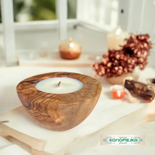 Okragła świeca w drewnie oliwnym o średnicy 12 cm. Świeca posiada drewniane knoty, które podczas spalania iskrzą, tworząc magiczną atmosferę.