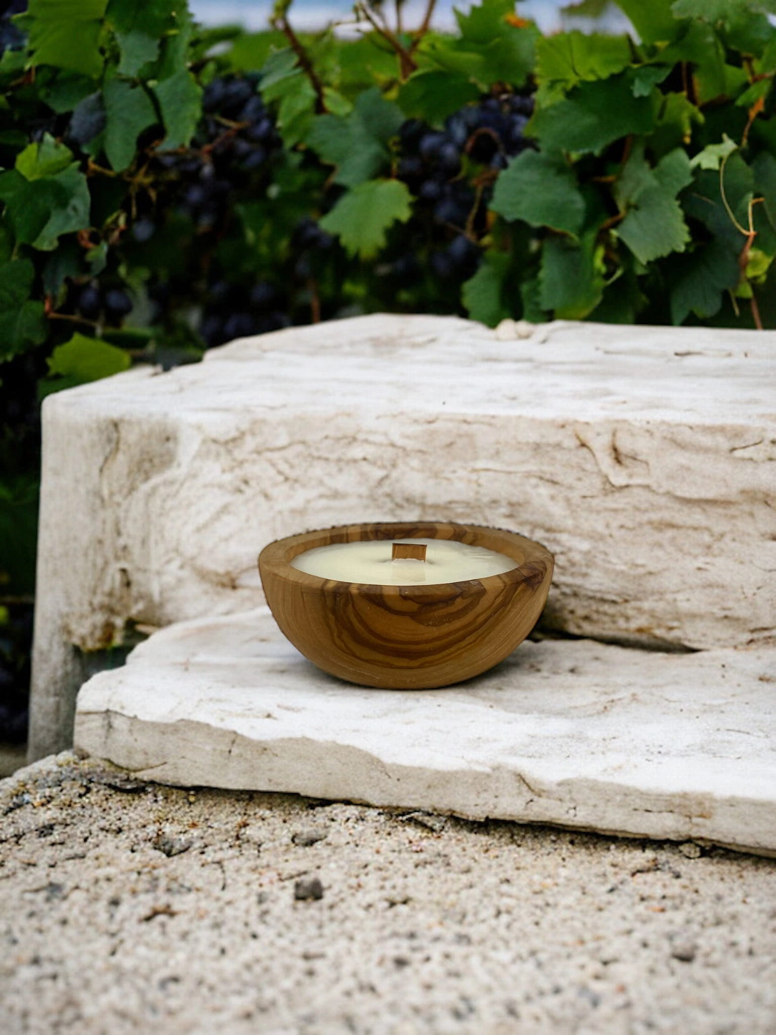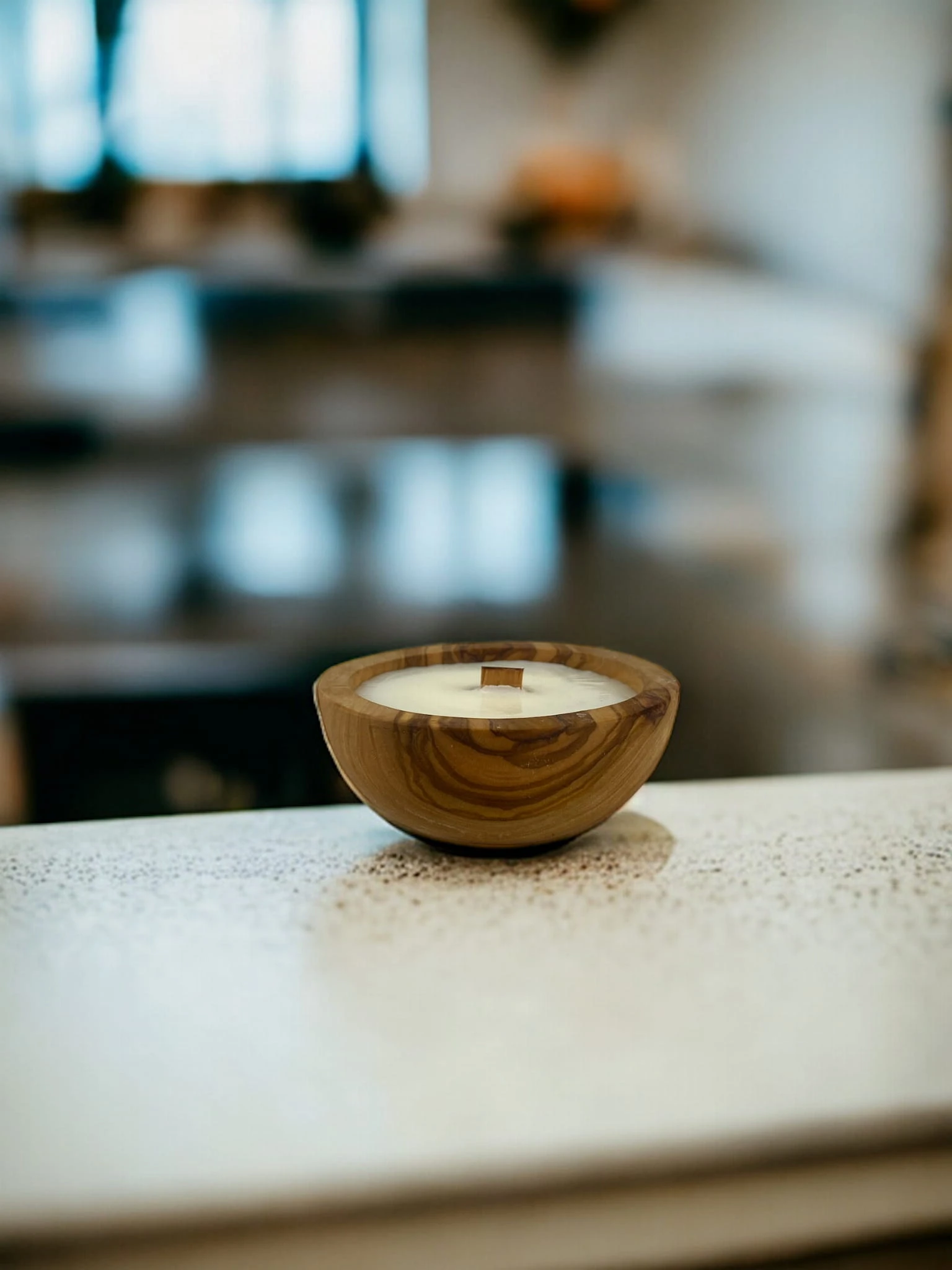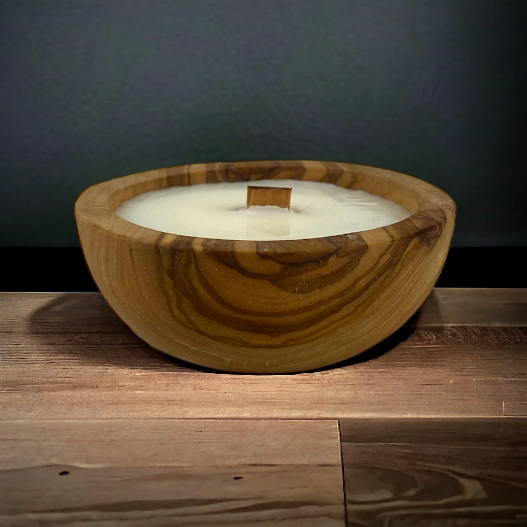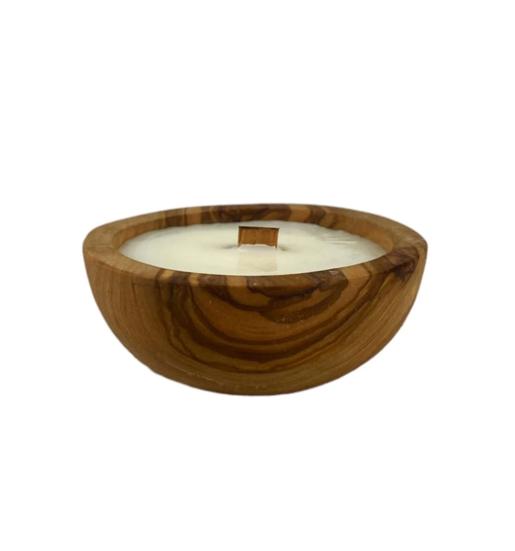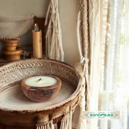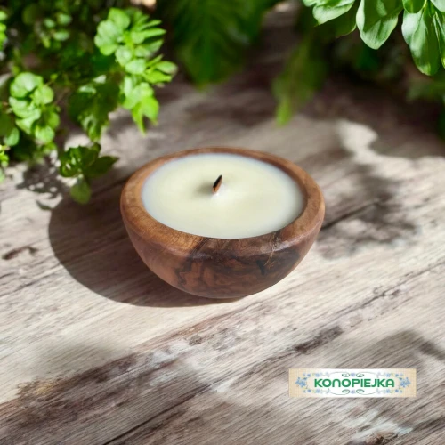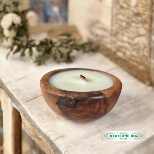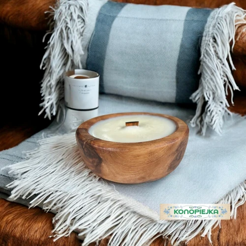 Ekskluzywna świeca zapachowa w rustykalnej misie z drewna oliwnego.