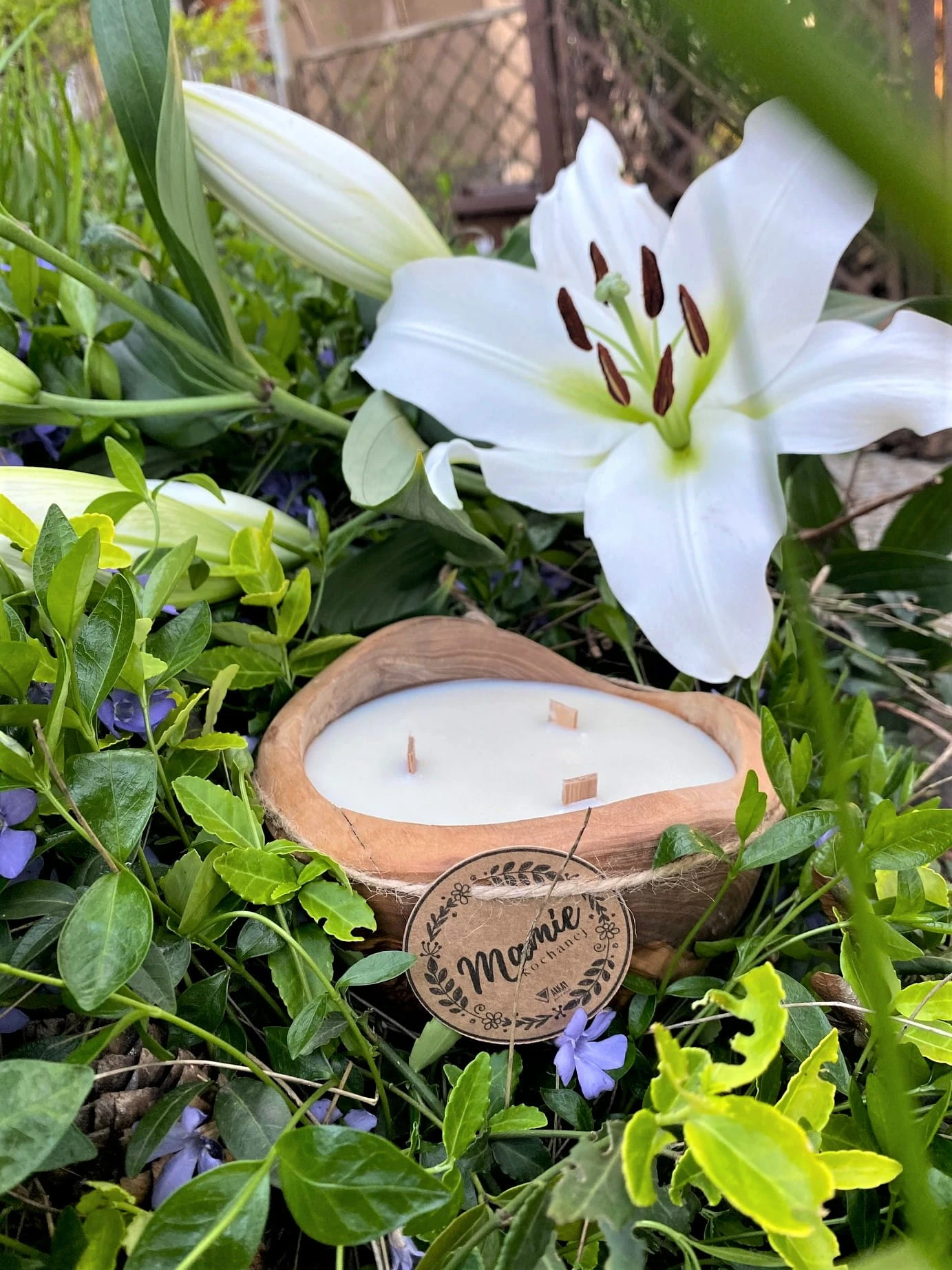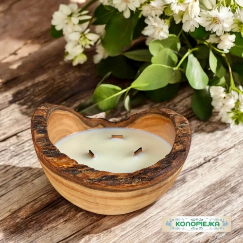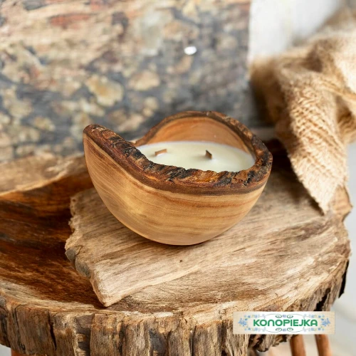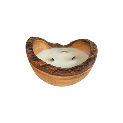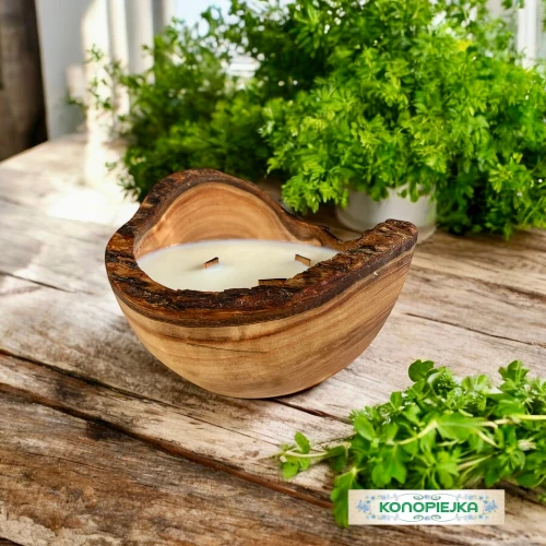 Okragła świeca w rustykalnej misie z drewna oliwnego o średnicy 14 cm. Świeca posiada drewniane knoty, które podczas spalania iskrzą, tworząc magiczną atmosferę.