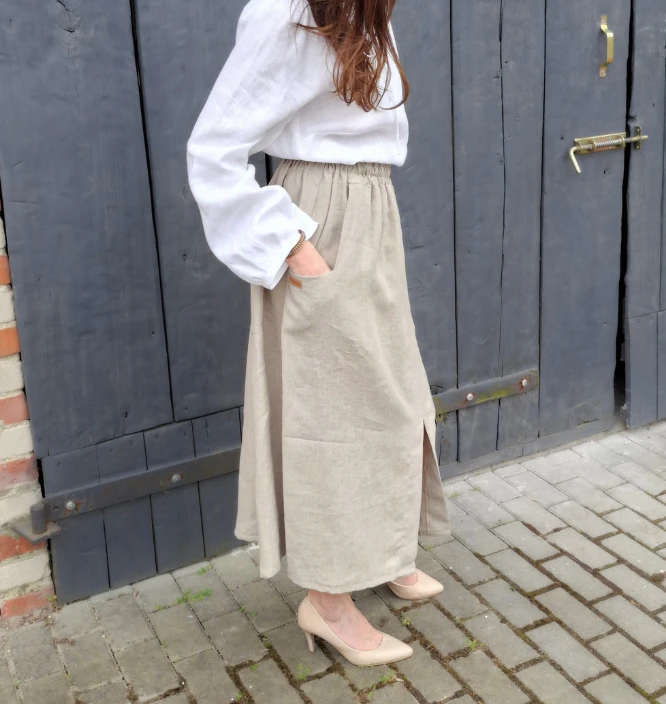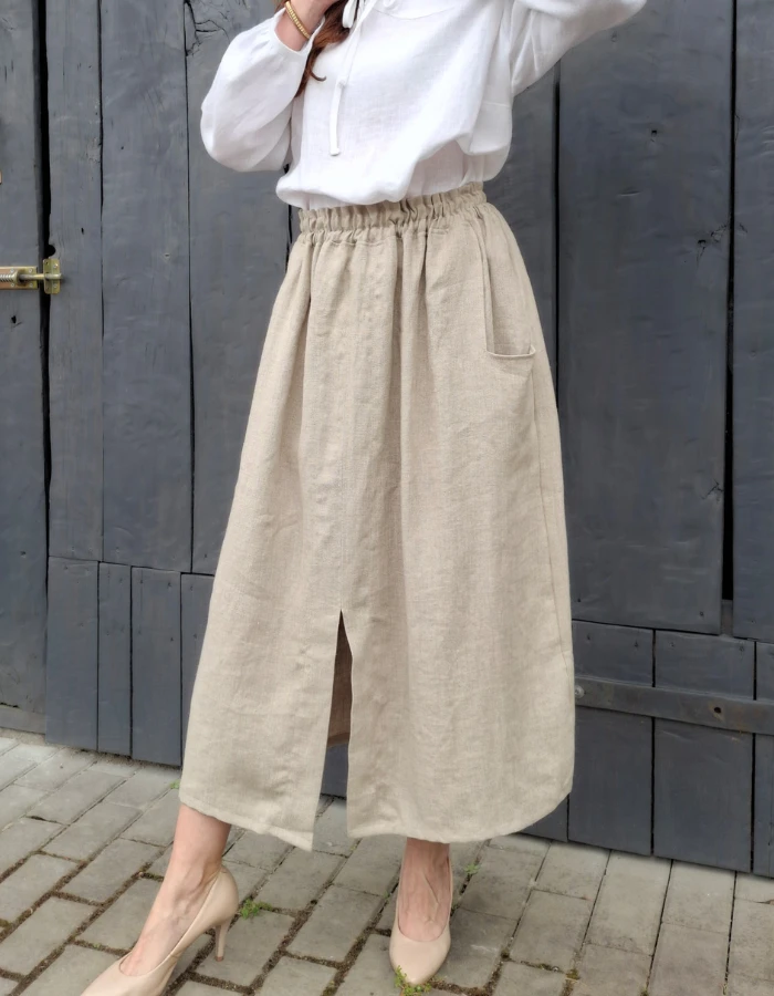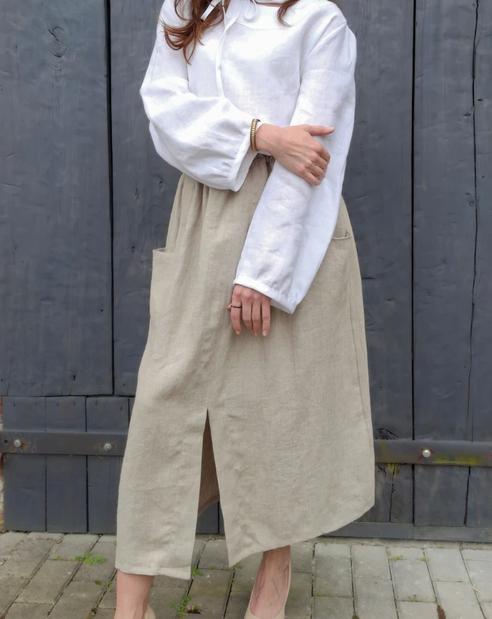 Spódnica z rozcięciem z przodu i kieszeniami, naturalny beż LEN 100% - rozmiar uniwersalny