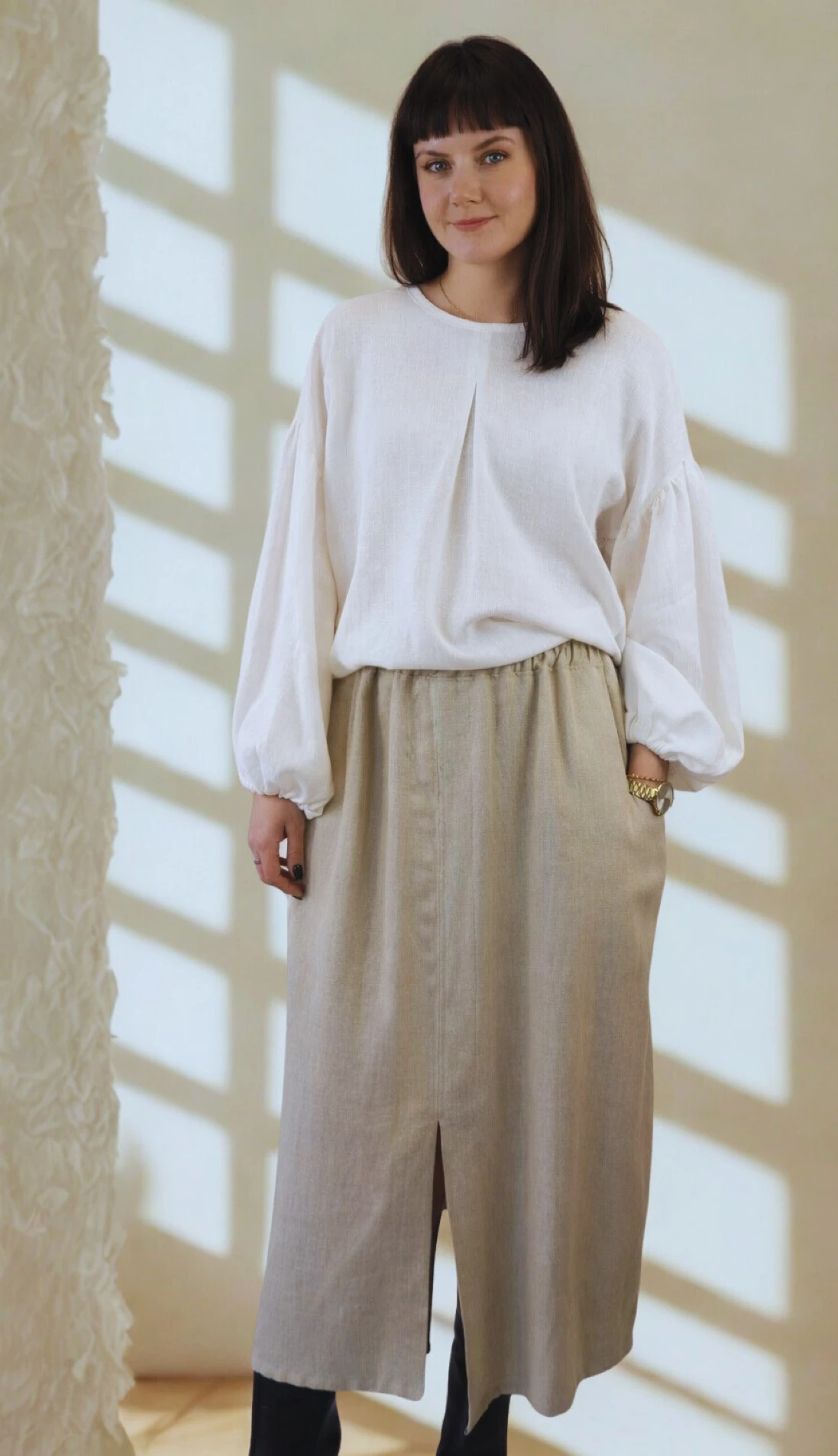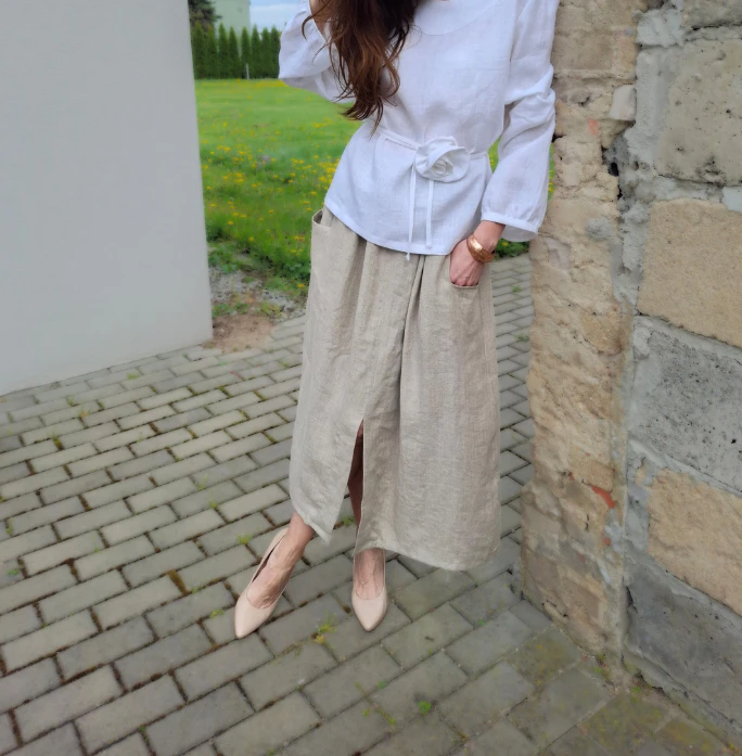 Spódnica uszyta z tkaniny lnianej o gramaturze 205g/m2 dzięki czemu nie musimy obawiać się prześwitywania. Model bardzo ponadczasowy z fantazyjnie, nieco geometrycznie wszytymi kieszeniami. Rozporek umieszczony w przedniej części by podkreślić kobiecość podczas chodzenia. Górna część wykończona podwójną gumką. Pozostawione zostały otwory, by móc swobodnie regulować obwód pasa dostosowując ją do indywidualnych potrzeb. Mimo klasycznego fasonu, te małe zabiegi konstrukcyjne nadały jej nieco charakteru by wykorzystywać ją nie tylko w letnich stylizacjach.