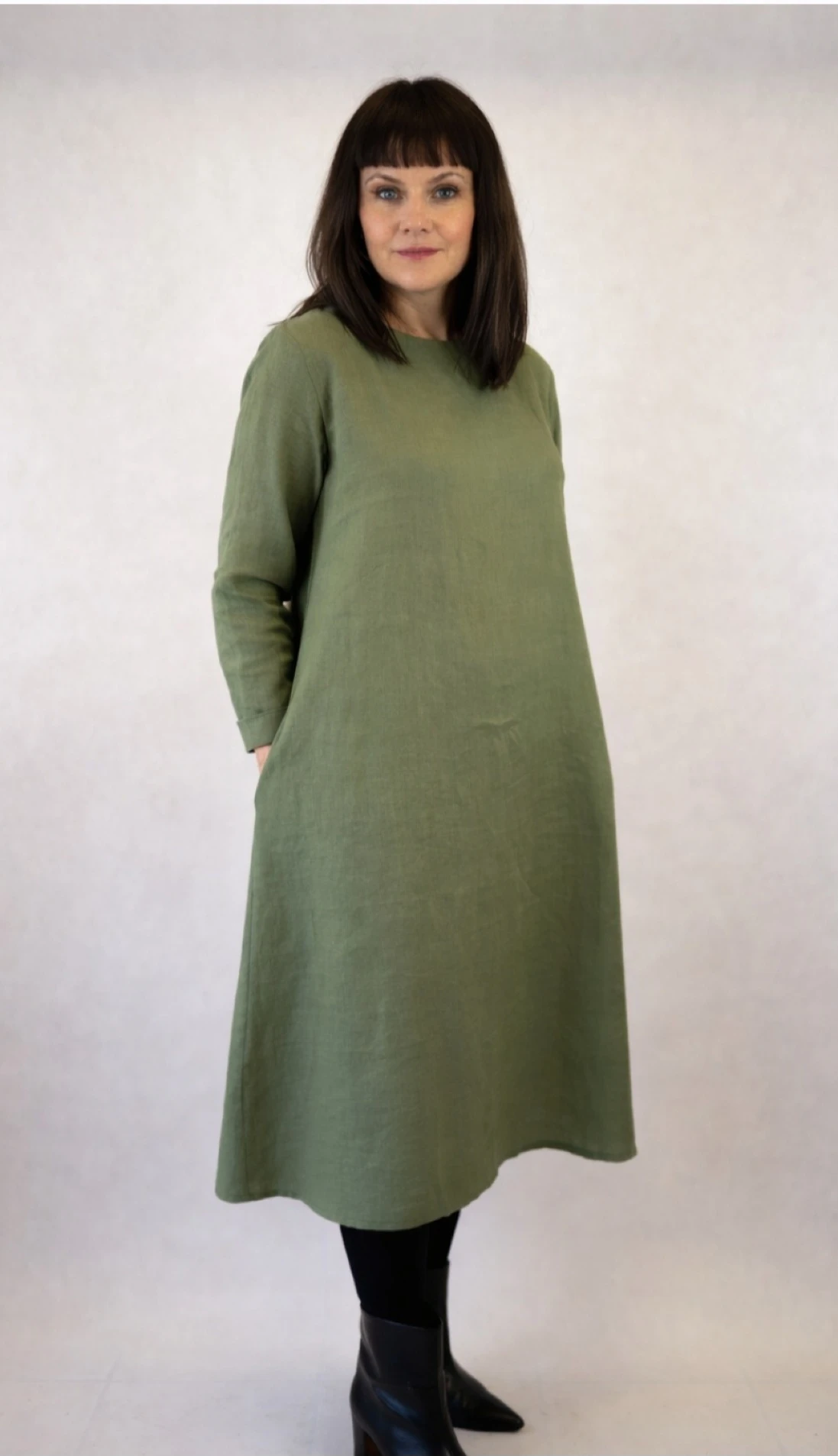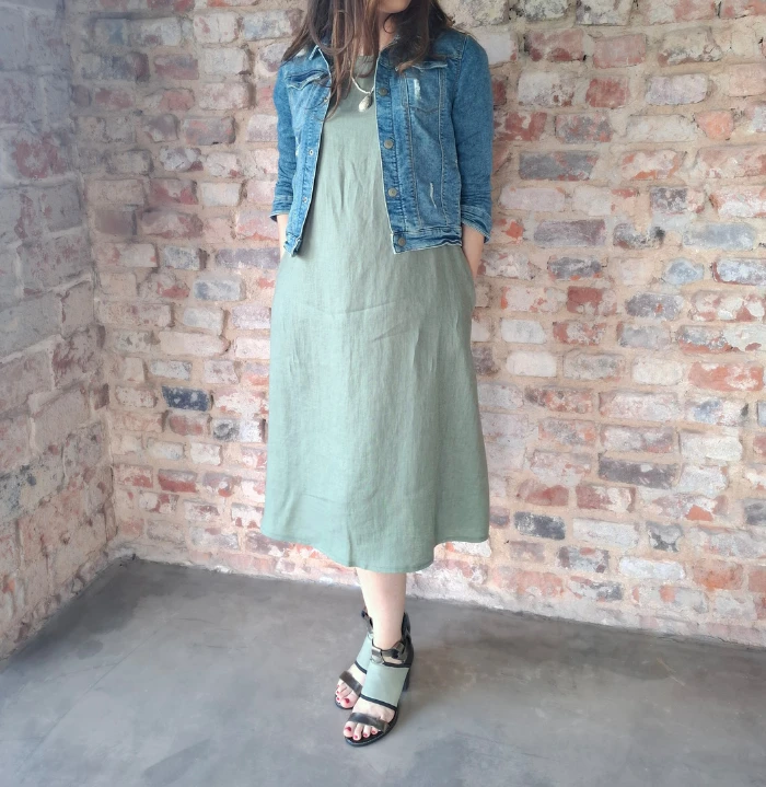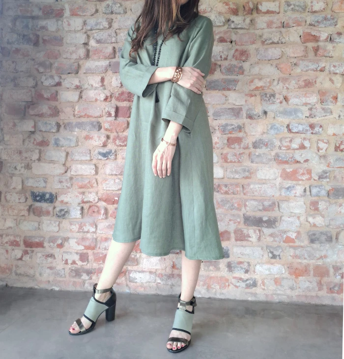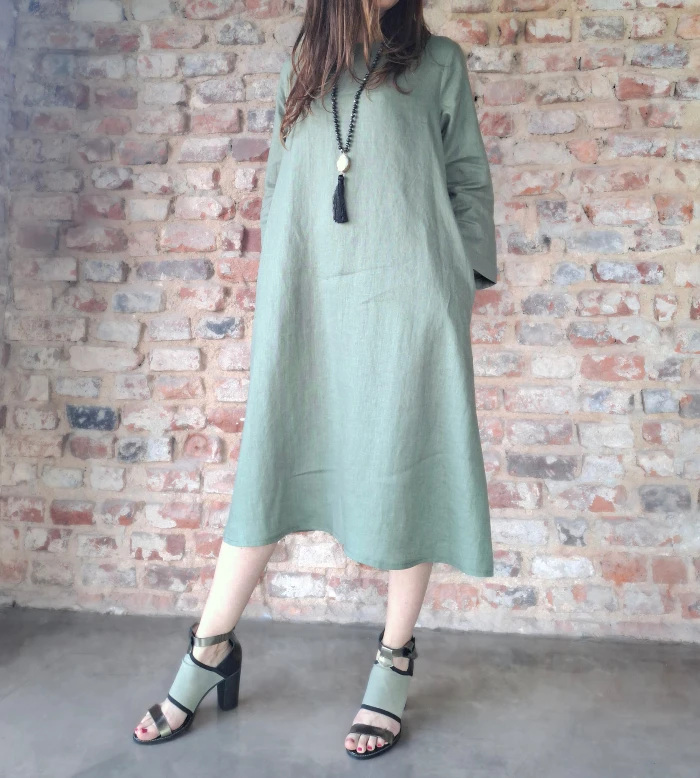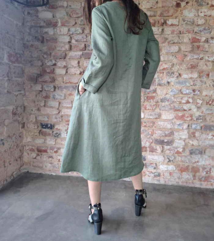 Klasyczna i ponadczasowa sukienka w kształcie litery A, z kieszeniami ukrytymi w szwy boczne. Długi rękaw wykończony wywijanym mankietem. Dekolt wykończony plisą, z tyłu zapinany na drewniany, kontrastujący guziczek. Wykonana z tkaniny 100% lnianej o gramaturze 205 g.