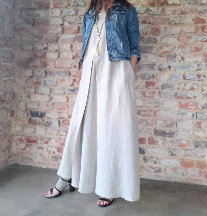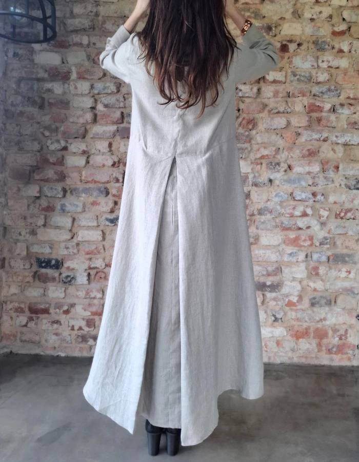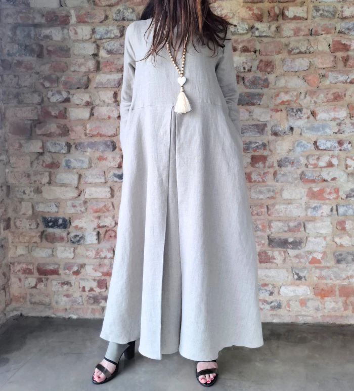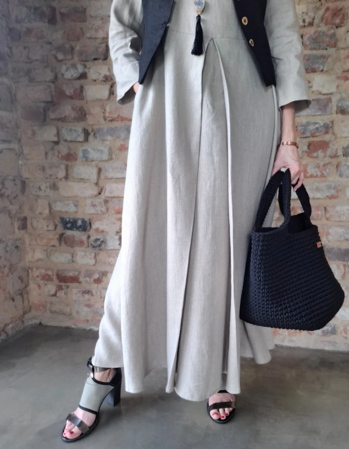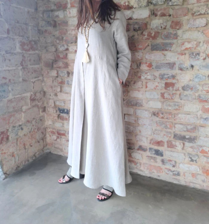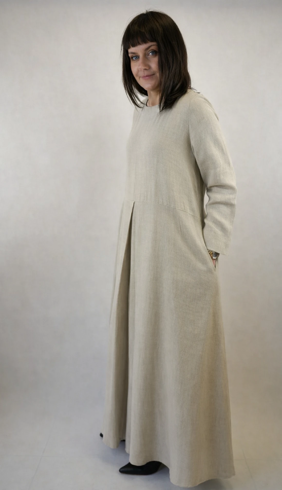 Sukienka wykonana z tkaniny 100% lnianej o gramaturze 230 g. Jest to długa sukienka z mocno rozkloszowanym dołem, bardzo wygodnym i pięknie "pracującym" podczas chodzenia. Ozdobne kontrafałdy nadają nietuzinkowego charakteru. Sukienka posiada kieszenie ukryte w szwach bocznych. Podkrój szyi wykończony plisą zapinany na guziczek w tylnej części. Rękaw 7/8 z możliwością podwinięcia.