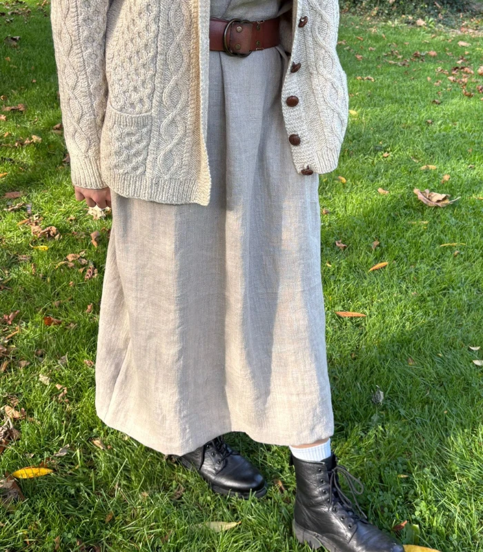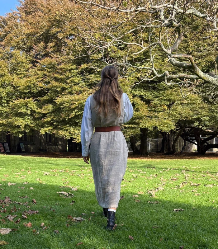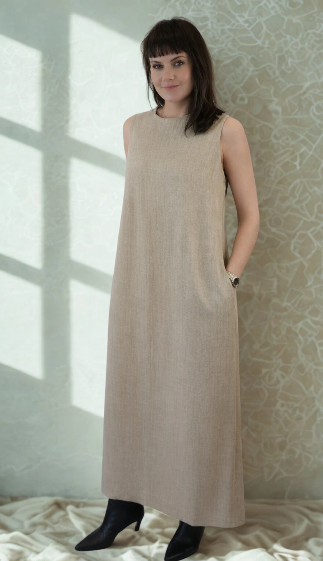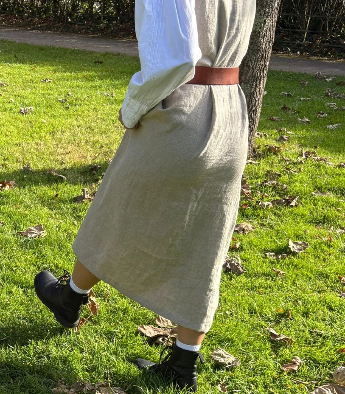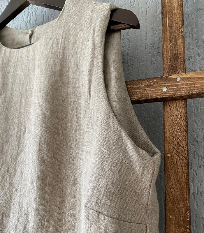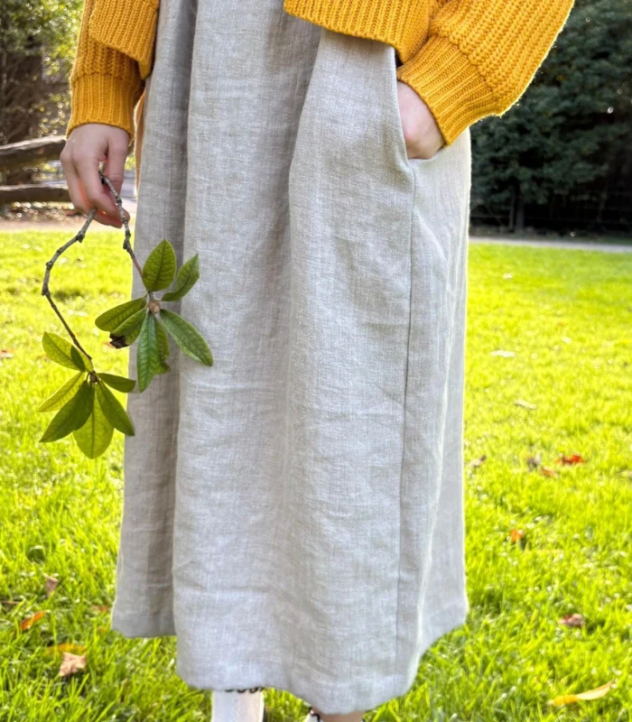 Prosta sukienka z lnu o gramaturze 230 g - naturalna elegancja i wygoda. Sukienka o minimalistycznym kroju princeski, uszyta z lekkiego, przewiewnego lnu o gramaturze 230 g, który zapewnia trwałość i komfort noszenia. Podkrój szyi oraz rękawów wykończony jest estetycznym obłożeniem, a tył zapinany na delikatny, drewniany guziczek, który podkreśla naturalny charakter modelu. Kieszenie wszyte w szwy boczne dodają sukience swobodnego, nieformalnego akcentu. To uniwersalna baza do wielu stylizacji - w połączeniu z białą koszulą i skórzanym paskiem nabiera klasycznego charakteru. Z kolei z wełnianym swetrem i solidnymi butami tworzy wygodny, codzienny look pełen naturalnego luzu.