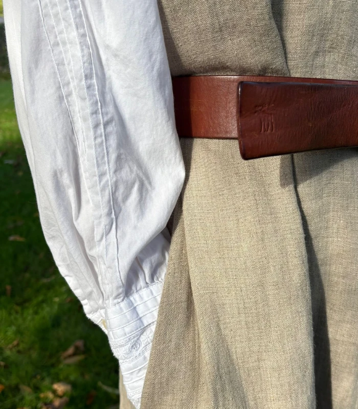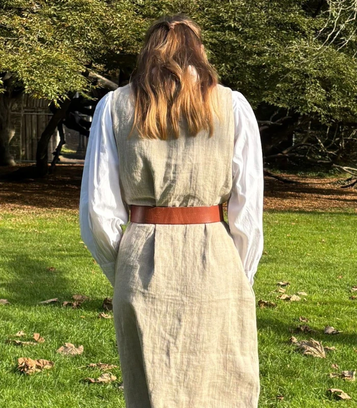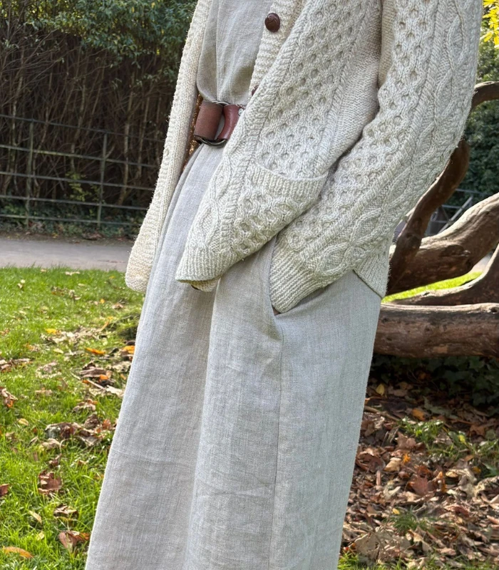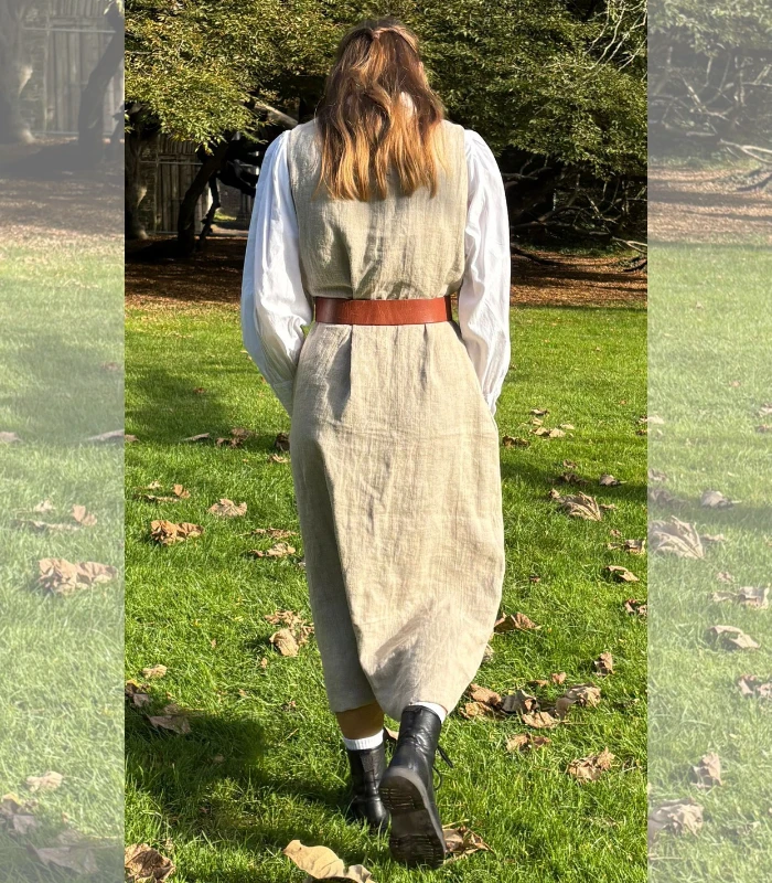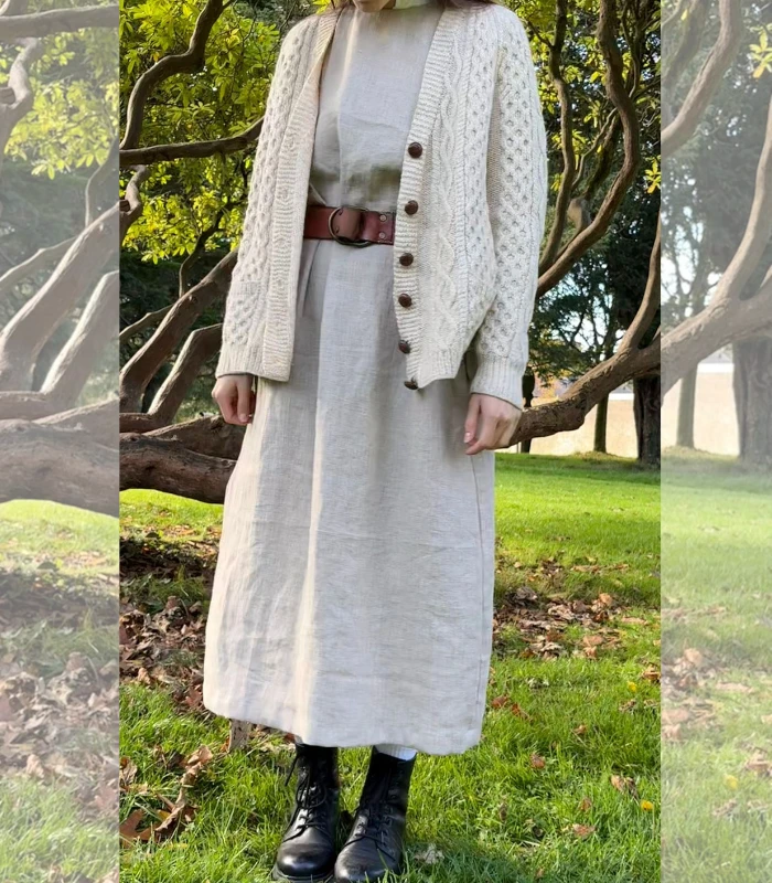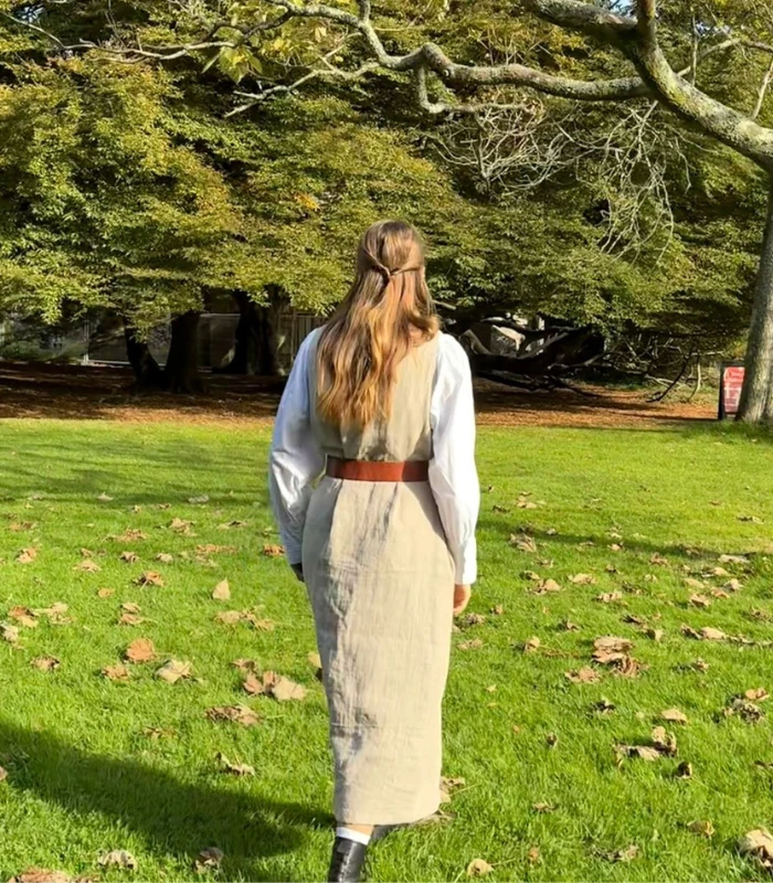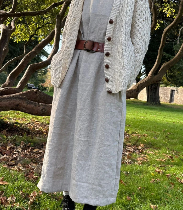 Prosta sukienka z lnu o gramaturze 230 g - naturalna elegancja i wygoda. Sukienka o minimalistycznym kroju princeski, uszyta z lekkiego, przewiewnego lnu o gramaturze 230 g, który zapewnia trwałość i komfort noszenia. Podkrój szyi oraz rękawów wykończony jest estetycznym obłożeniem, a tył zapinany na delikatny, drewniany guziczek, który podkreśla naturalny charakter modelu. Kieszenie wszyte w szwy boczne dodają sukience swobodnego, nieformalnego akcentu. To uniwersalna baza do wielu stylizacji - w połączeniu z białą koszulą i skórzanym paskiem nabiera klasycznego charakteru. Z kolei z wełnianym swetrem i solidnymi butami tworzy wygodny, codzienny look pełen naturalnego luzu.