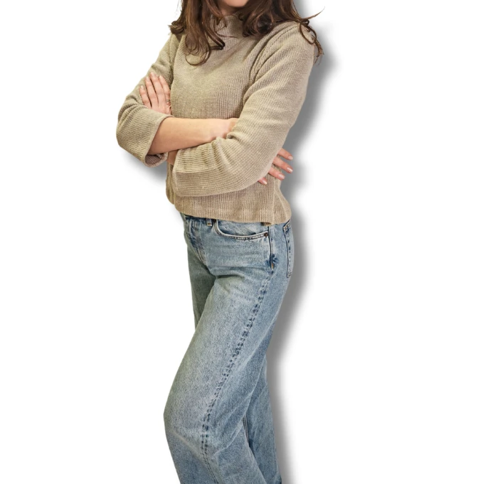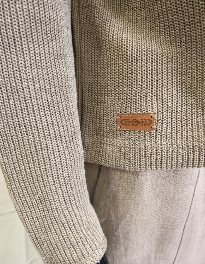 Sweter damski o fasonie oversize, w 100% z lnu. Wykonany z dzianiny dwułożyskowej co sprawia, że jest bardzo sprężysty i mięsisty. Podkrój szyi wykończony półgolfem, co nadaje niesamowitej klasy i elegancji. Ponadczasowy kolor naturalnego lnu i fason pozwolą na całoroczne wykorzystanie go w Twojej garderobie. Dobrze wyglądał będzie zestawiony z jedwabną spódnicą, jak również z klasycznymi dżinsami. Świetnie sprawdzi się w podróży dając komfort i wygodę, podczas wiosennych spacerów, czy zwyczajnym casualowym looku. Rękawy swetra uszyte zostały tradycyjnie, jednak dół pozostał luźny, obszyty lnianą lamówką, co dodaje mu jeszcze większej elegancji i wyjątkowości.