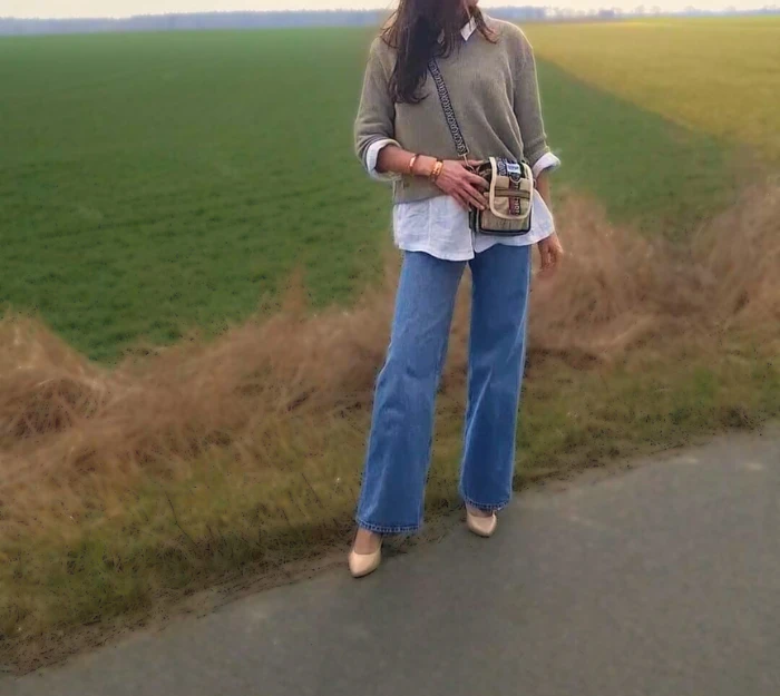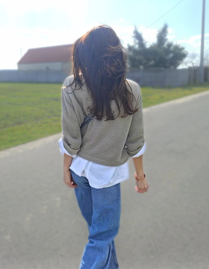 Krój kubełkowy tego sweterka można wykorzystać w wielu ciekawych stylizacjach. Można pod niego założyć białą koszulę, wypuścić dołem, wyciągnąć mankiety dzięki szerszym rękawom sweterka i tym samym podkreślić luźną elegancję. Do tego świetnie wyglądać będą dżinsy, eleganckie spodnie czy długa jedwabna spódnica. Ulubiona biżuteria podkreśli Twój styl, a dzięki naturalnemu odcieniu lnu bursztyn czy biżuteria miedziana będzie wspaniale widoczna.