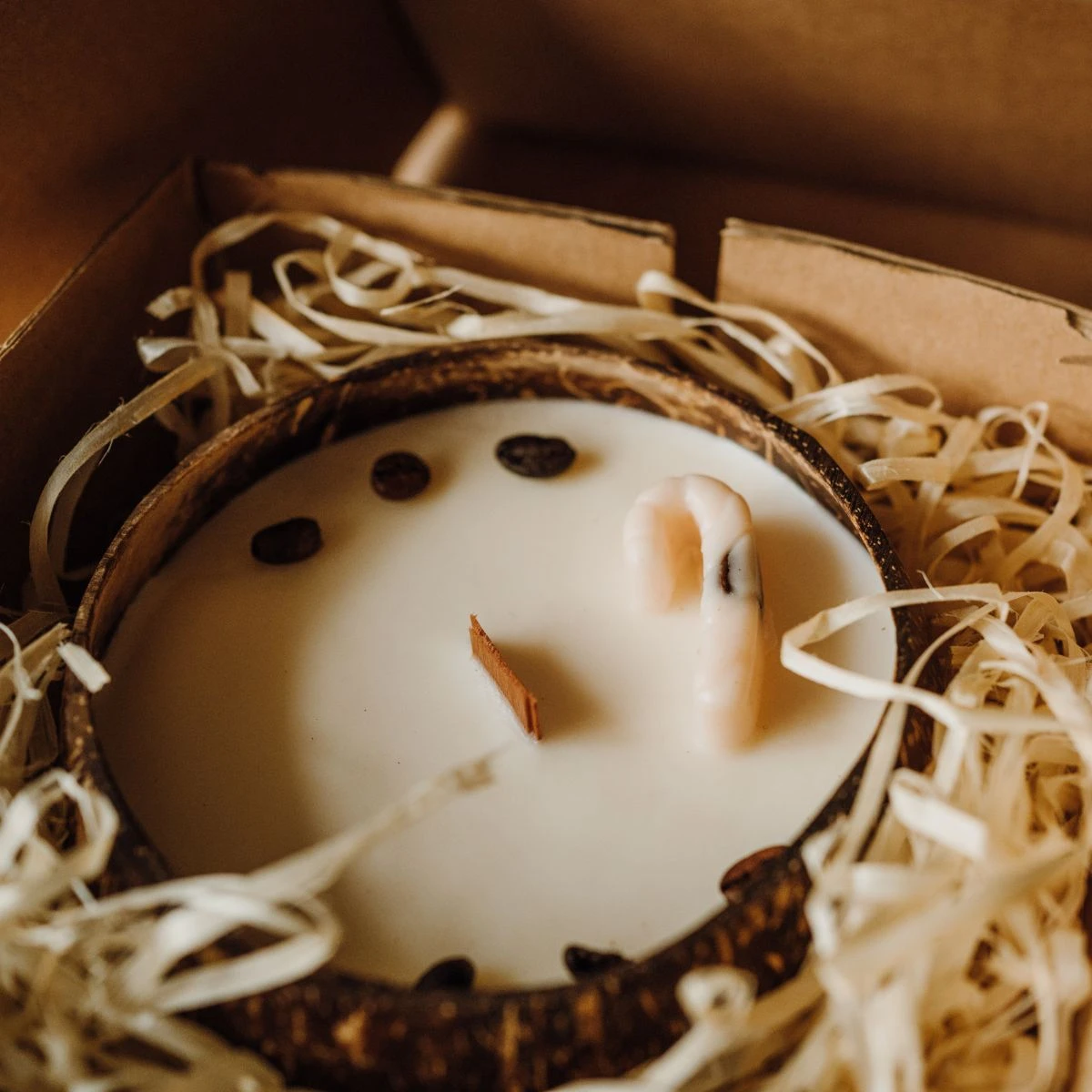 Luksusowa świeca sojowa "Cukierkowe Mochaccino" w oszlifowanej łupinie kokosa