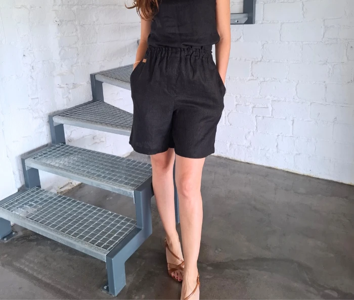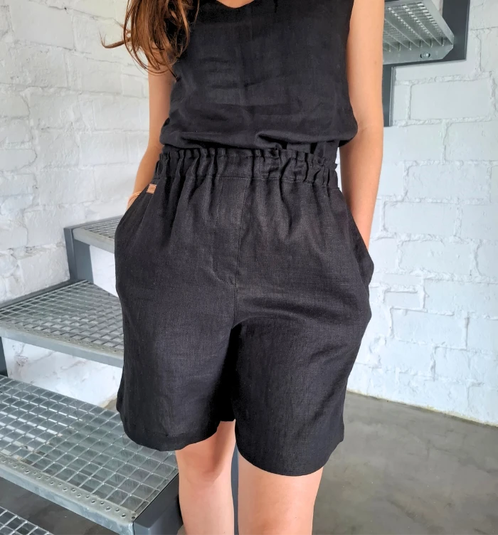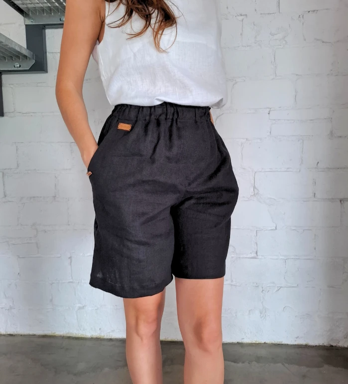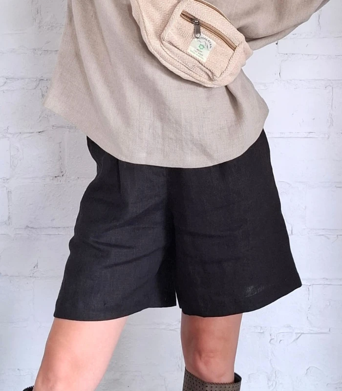 Szorty LNIANE, spodenki damskie LEN 100% - CZARNE